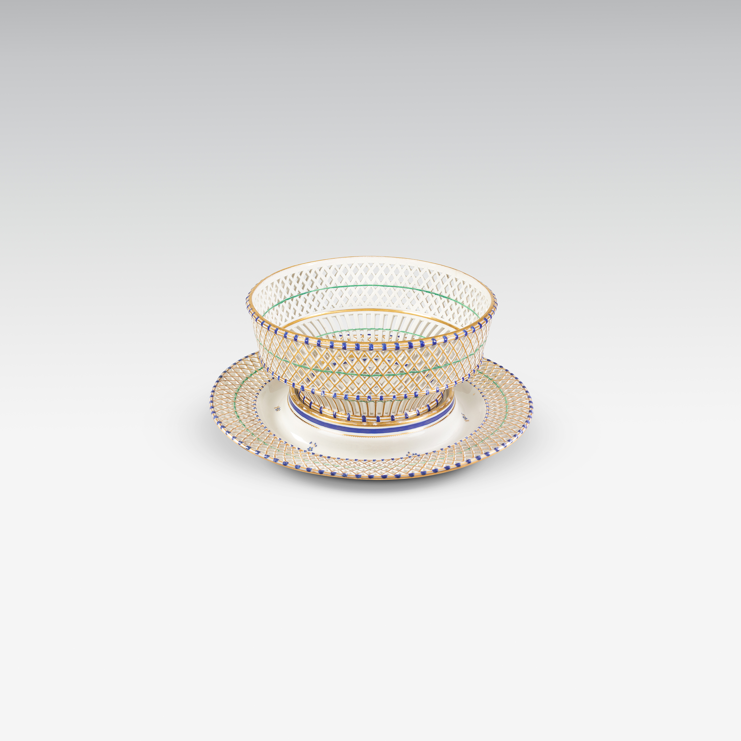 Der Zitronenkorb mit Untersatz (Presentoir) ist in der Art von Korbgeflecht durchbrochen. Die Vergoldung wird durch, einzelne grüne und blaue Linien und Vergissmeinnicht als Streublumenmuster ergänzt.