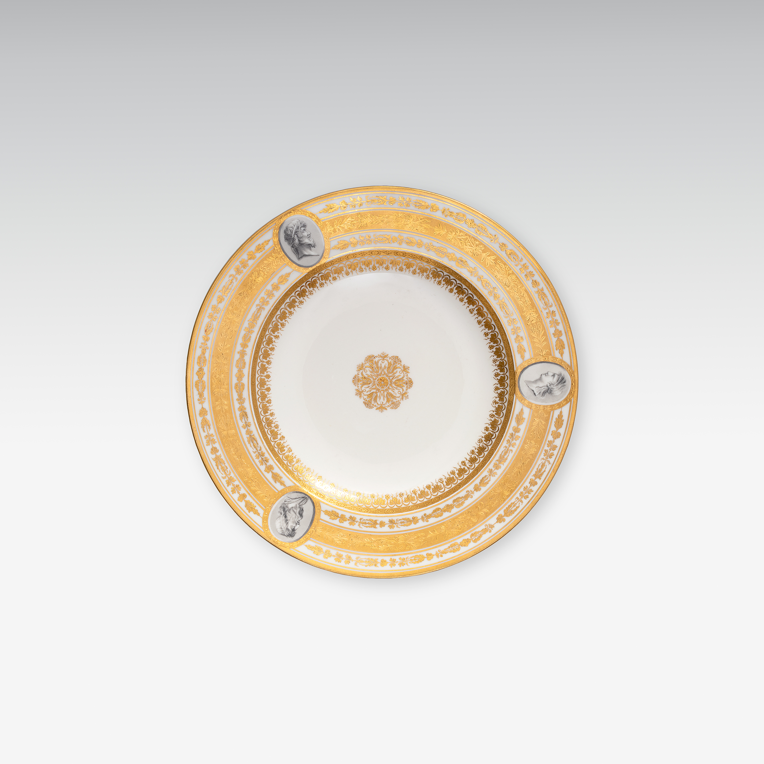 Teller mit reichem Goldrelief und antikisierenden Philosophenbüsten en grisaille.