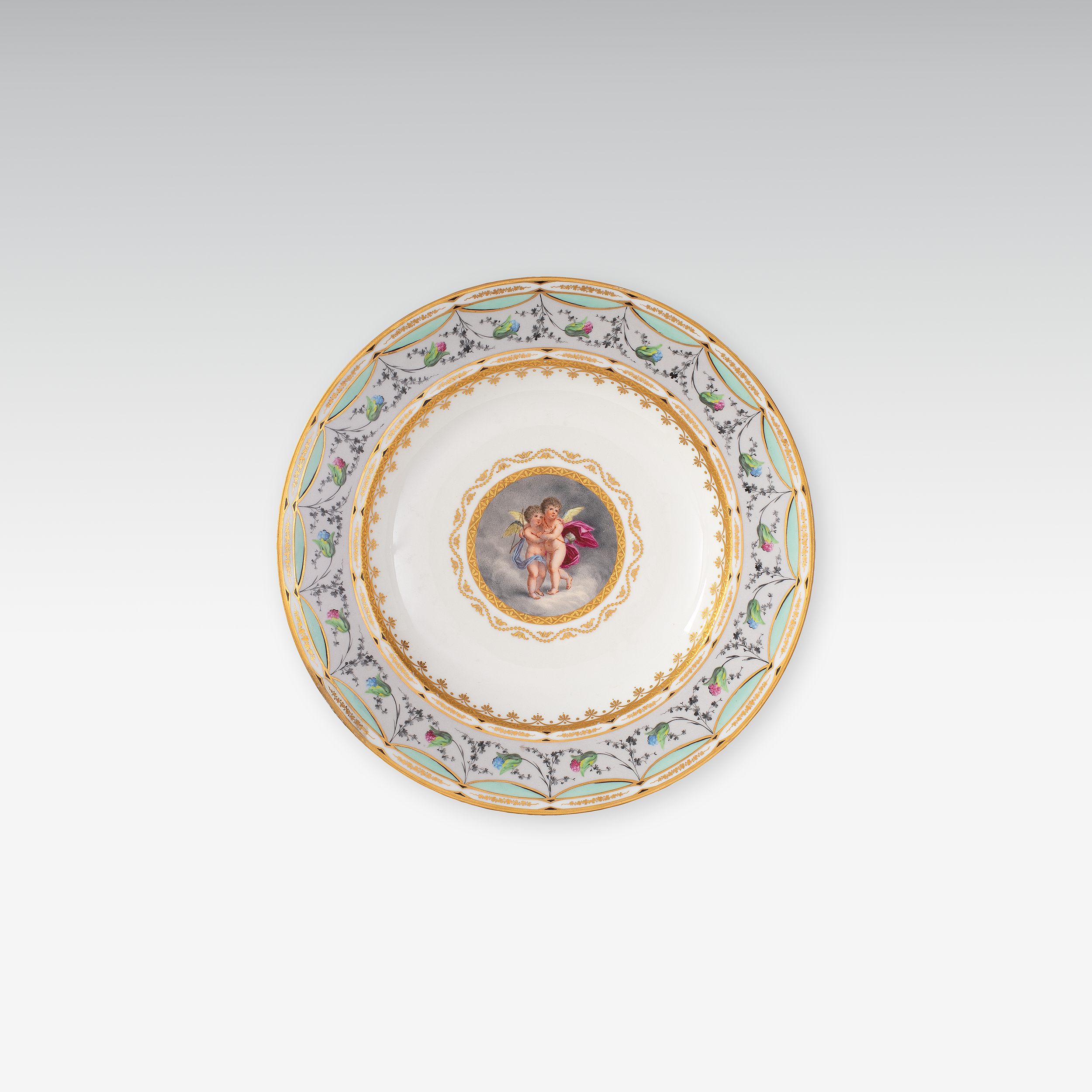 Der Teller (von drei erhaltenen Exemplaren einer Serie) ist im zentralen Medaillon mit einem Amorettenpaar sowie einer floralen Randbordüre bemalt.