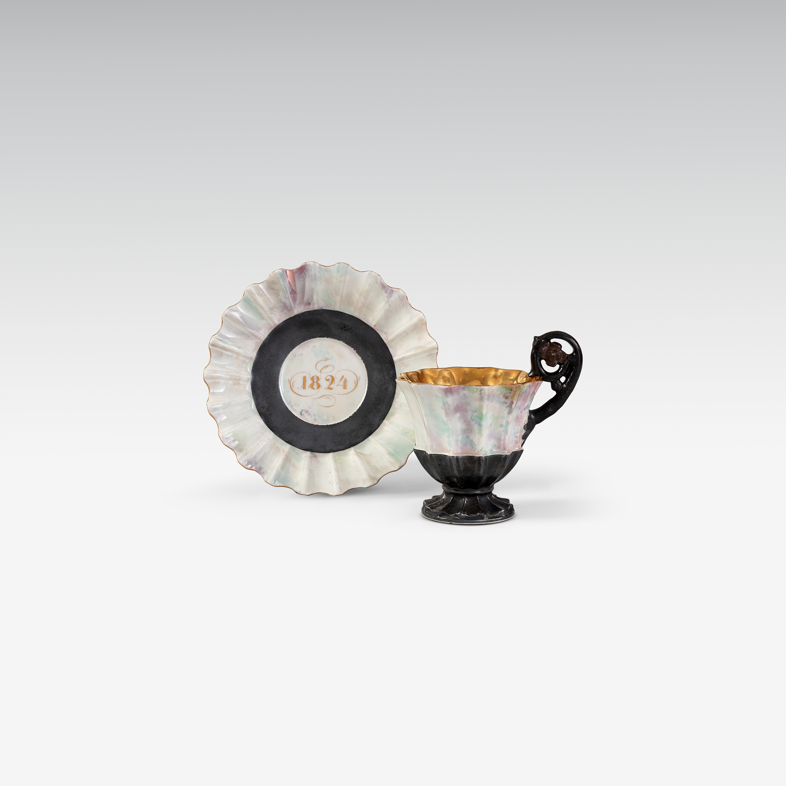 Die Erinnerungstasse und Untertasse in Muschelform ist mit Perlmuttdekor bemalt, die Untertasse mit vergoldeter Jahreszahl 1824.