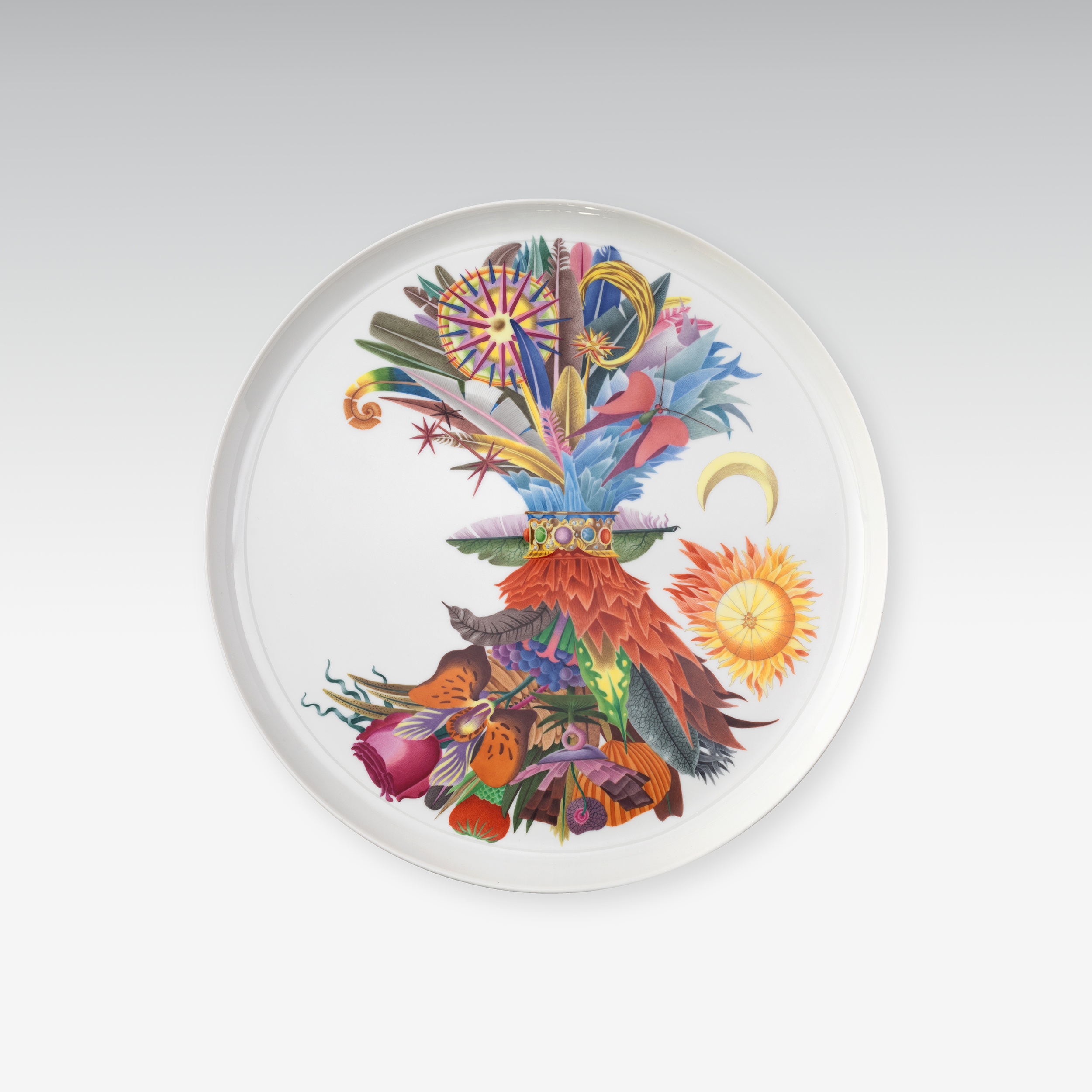 Wolfgang Hutter, Vertreter der Wiener Künstlergruppe des Phantastischen Realismus, gestaltete die große Platte für die Triennale in Mailand 1954 im Auftrag der Wiener Porzellanmanufaktur Augarten.