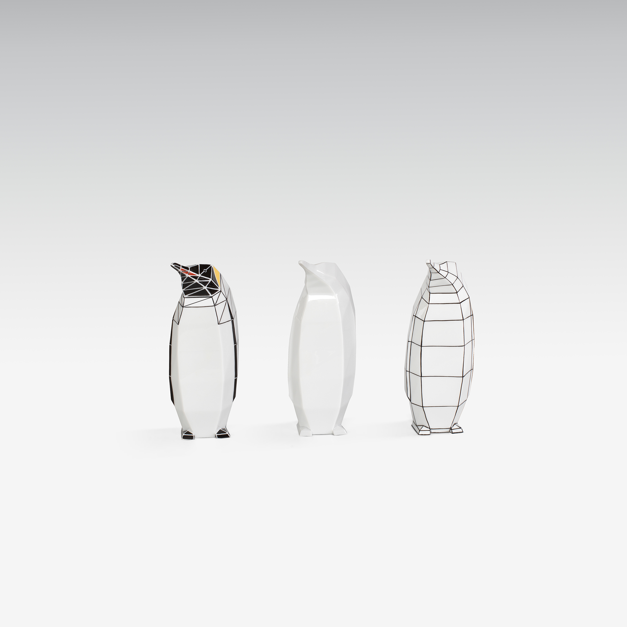 Design von MOSTLIKELY auf Basis von gefalteten Papiermodellen mit drei unterschiedlichen Dekoren, eine Version unbemalt, links ein Design des ehemaligen Augarten Obermalers Isidor Stern.