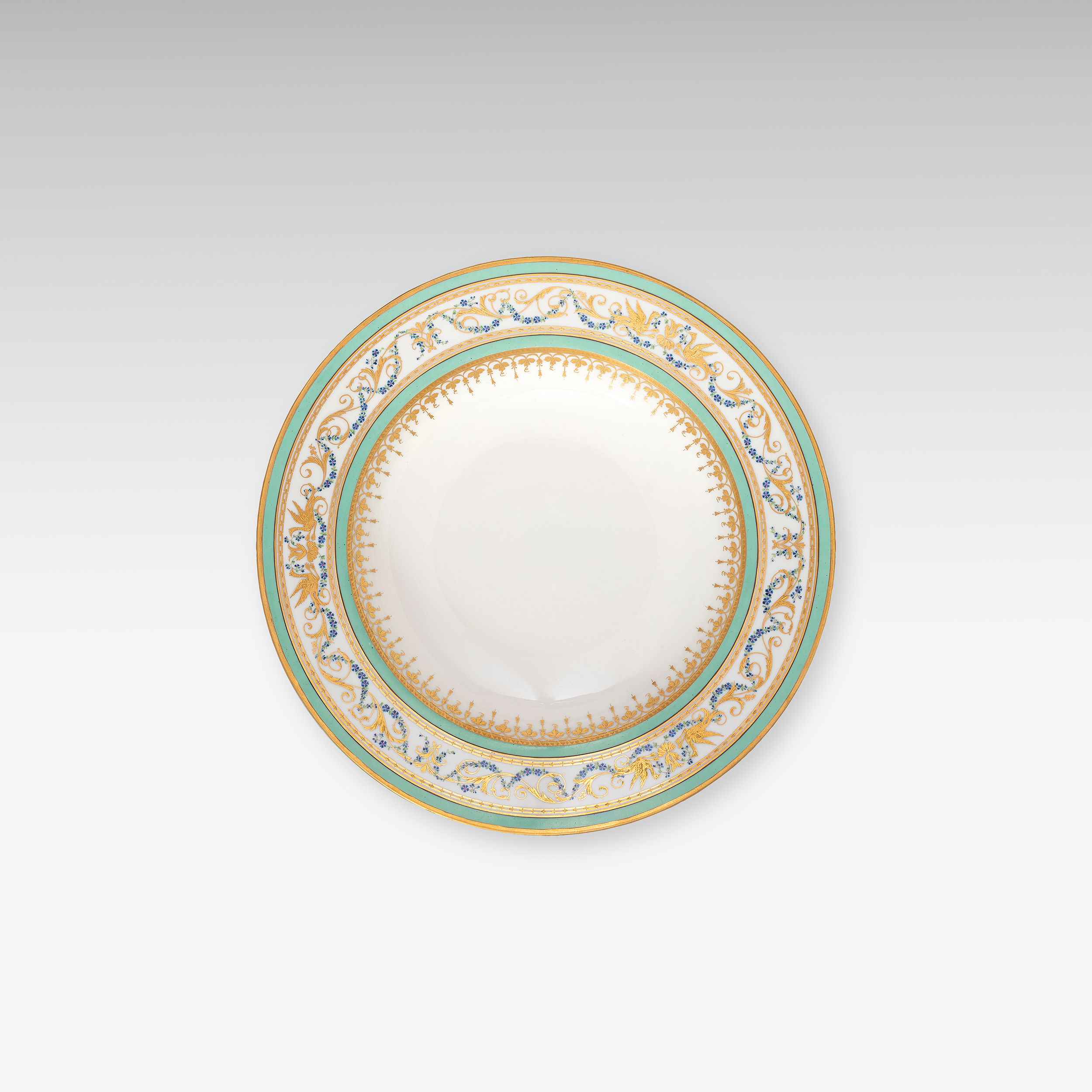 Der klassizistische Teller aus einem Speiseservice ist mit seegrünem Fond, klassizistische Ornamentik in Goldrelief, Vögeln sowie Kornblumengirlanden reich bemalt.