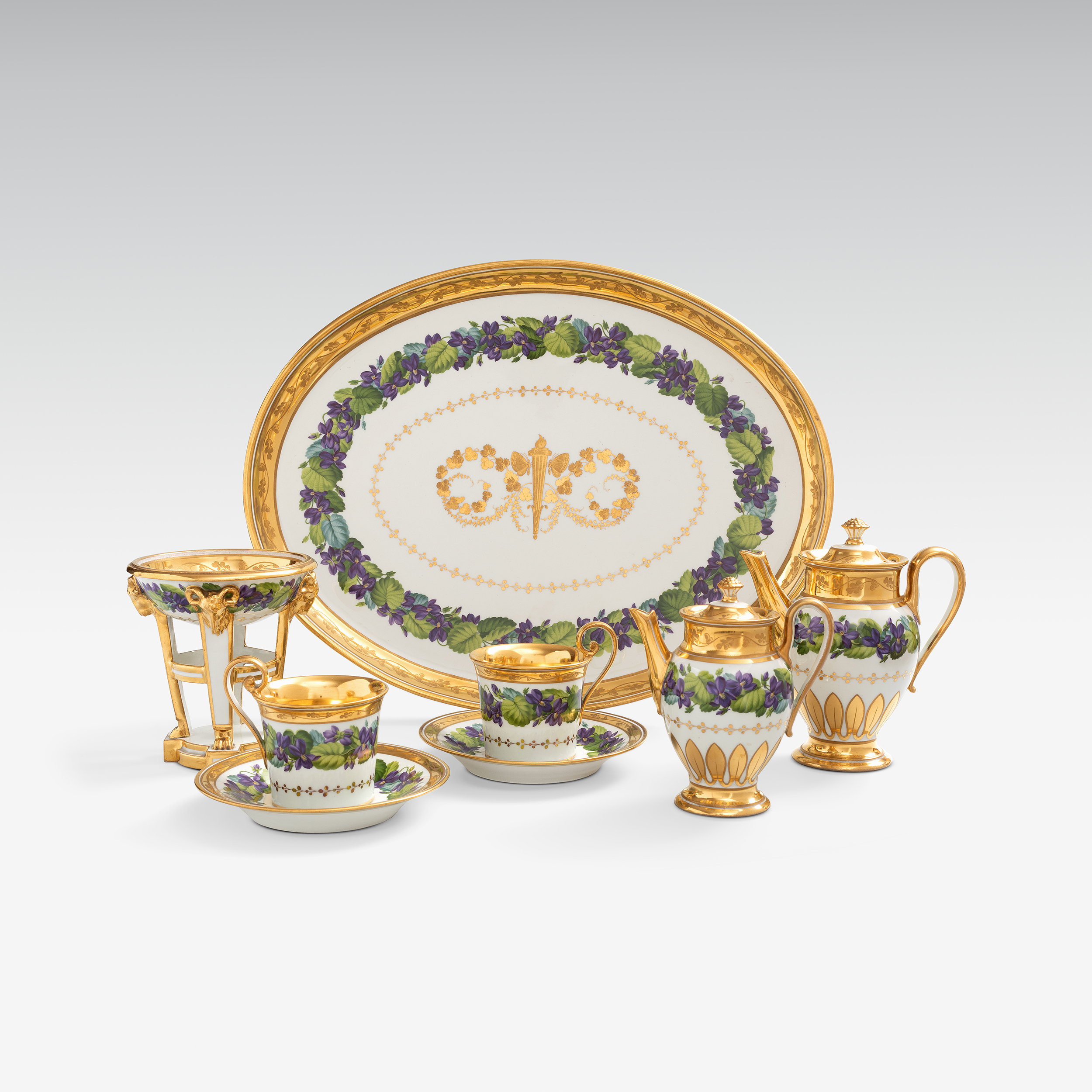 Das Frühstücksservice für zwei Personen besteht aus einem Tablett, zwei Kannen mit Deckeln, zwei Tassen und Untertassen sowie einem Zuckeraufsatz. Die Blumensprache des Veilchendekors, einem Symbol bescheidener, aber wahrer Liebe, wird auf dem Tablett von einem Schmetterlingspaar und einer flammenden Fackel als ergänzt.