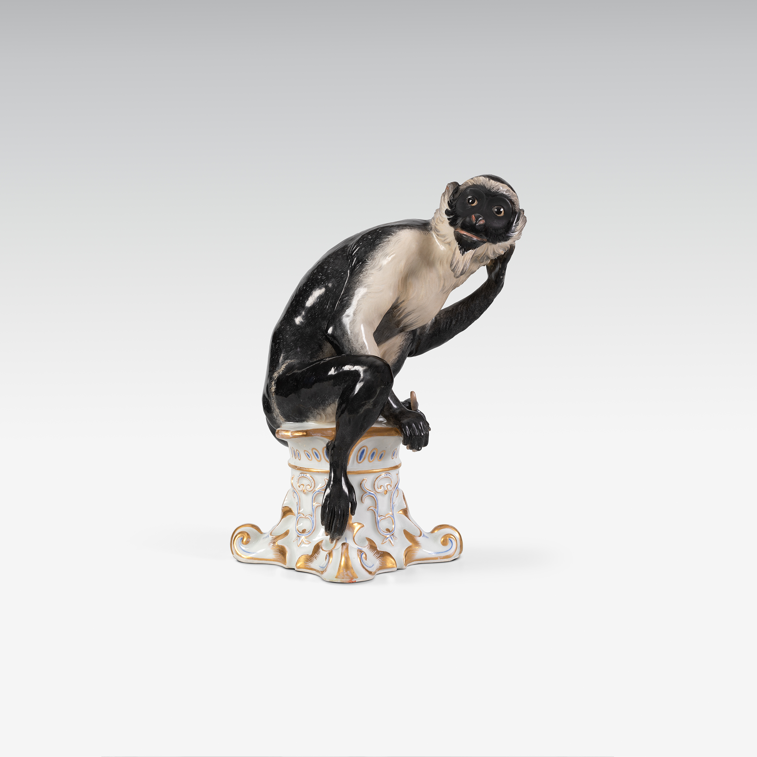 Dianameerkatze modelliert in der Art naturwissenschaftlicher Studienobjekte, der Sockel bezeichnet: Cercopithecus diana.