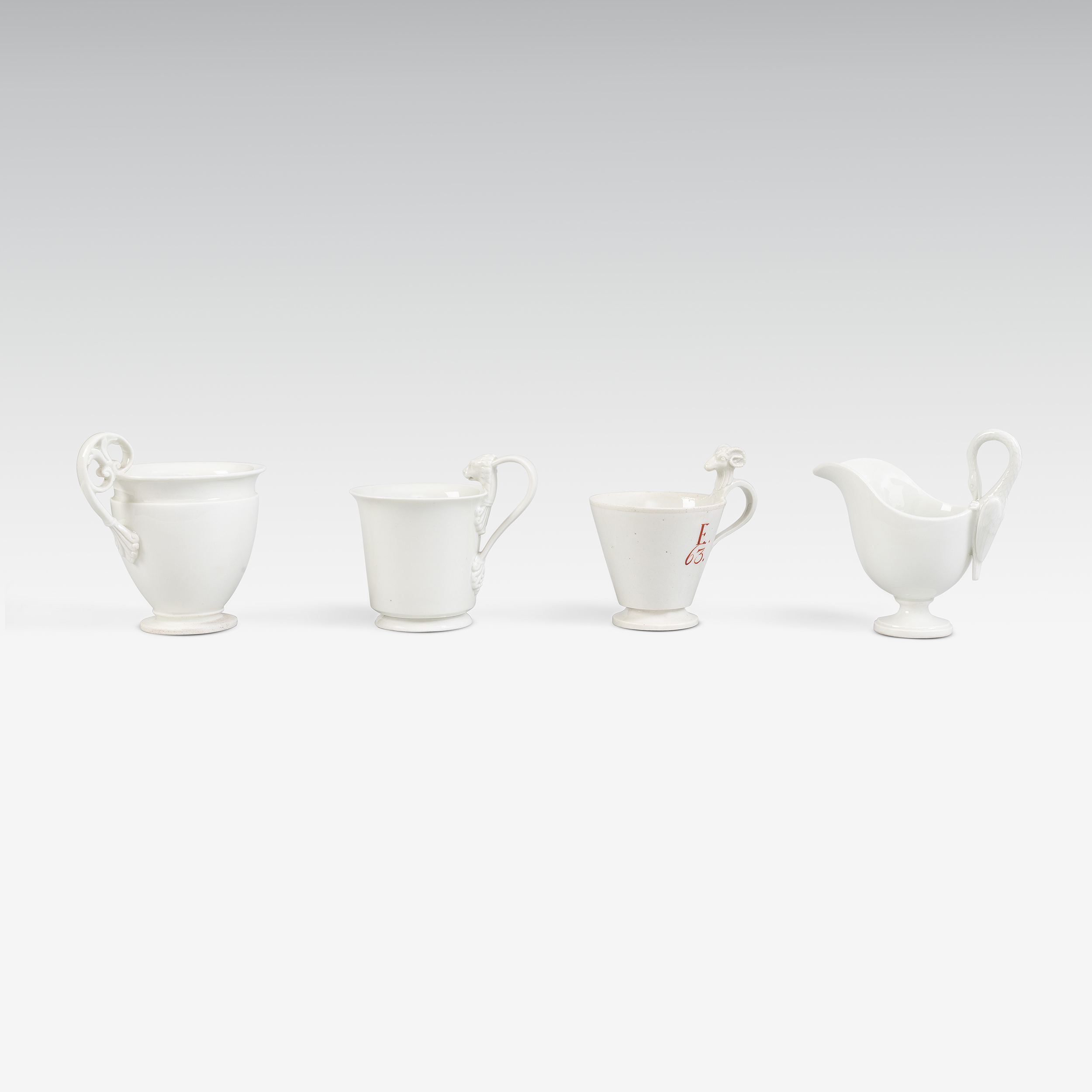 Vier Mustertassen mit Henkeln in Form einer Palmette, eines Löwenkopfs, eines Widderkopfs (E.63.) und eines Schwans.