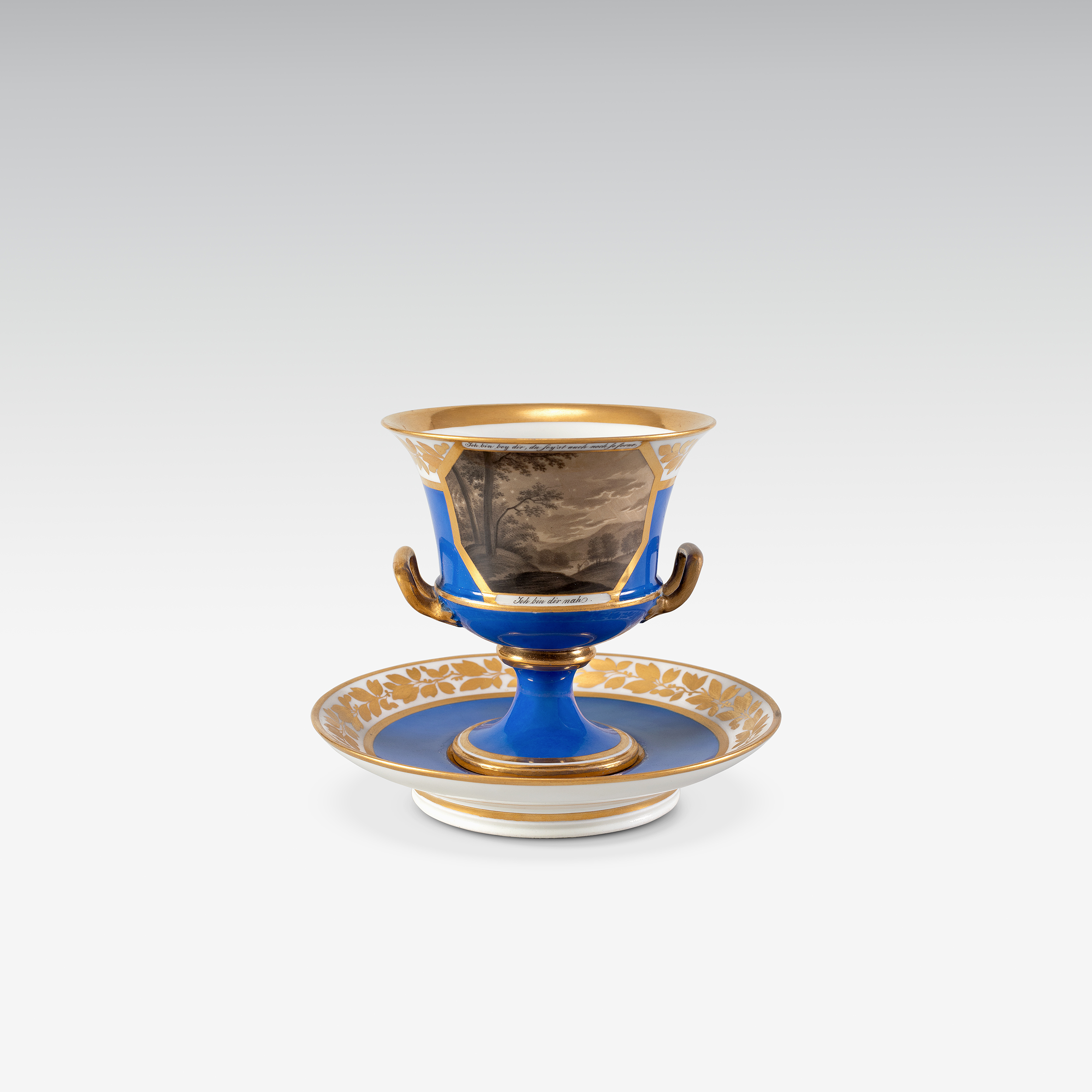 Pokal mit Untersatz, Kobaltfond, beidseitige Sepiamalerei mit Inschrift, nach "Nähe des Geliebten" von J.W. von Goethe, Kaiserliche Porzellanmanufaktur Wien, um 1830 (Ansicht 2)