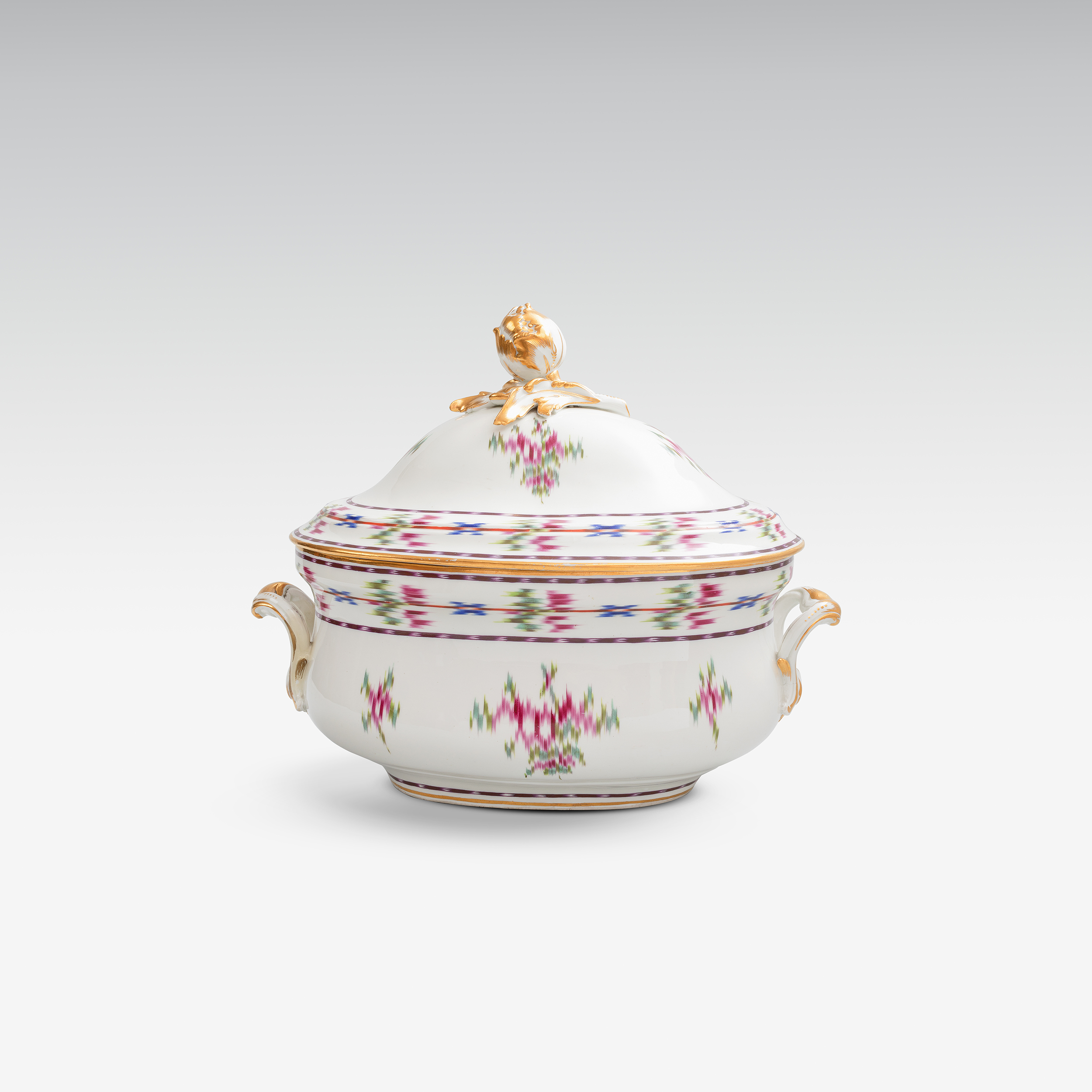 Deckelterrine mit Dekor chiné à la branche (Ikat) und einem Knospenknauf