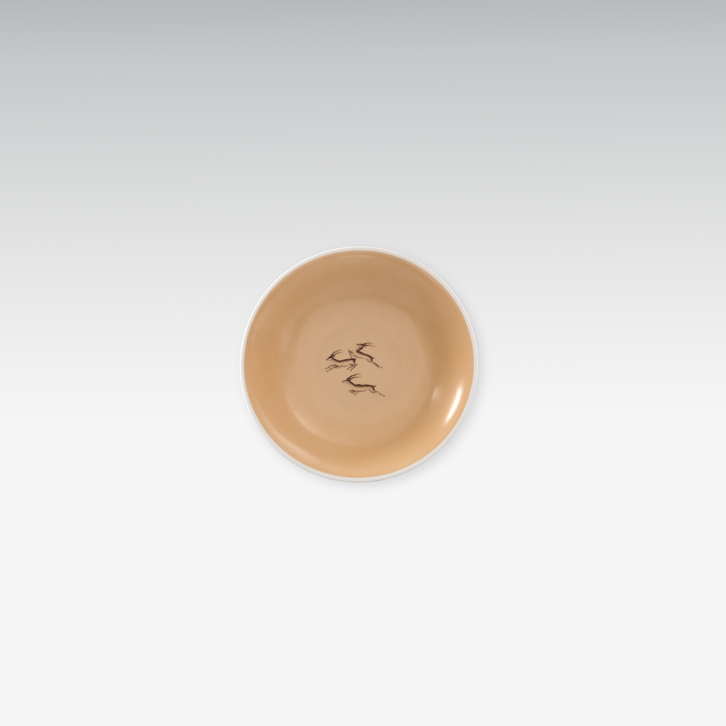 Flache Schale, Form 617, mit hellbraunem Fond und drei Gazellen, Dekor Nr. 6547 von Obermaler Edwin Breideneichen.