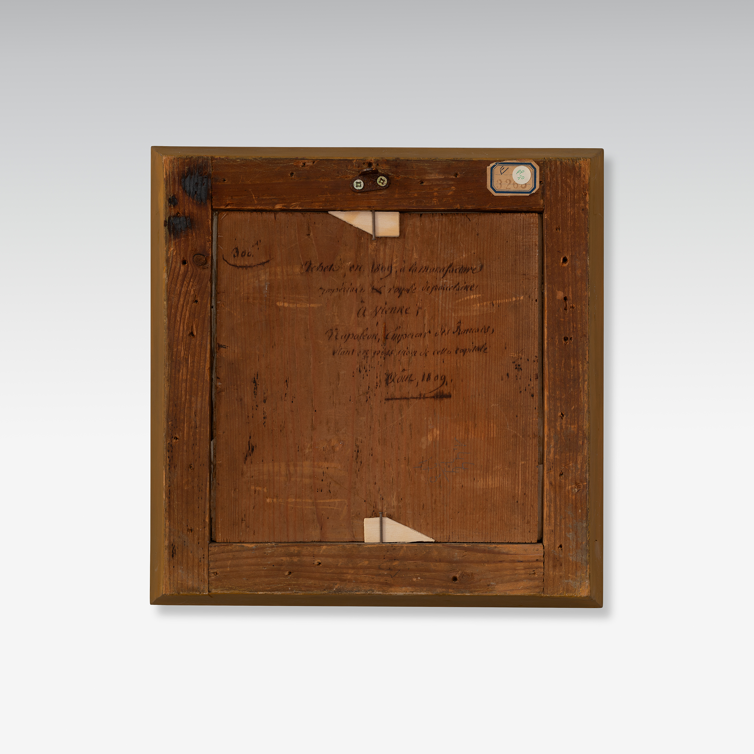 Rückseite mit Inschrift: "Acheter (sic) en 1809 à la manufacture/Impériale et royale de porcelaine/ à Vienne/ Napoléon, Empereur des Français/Etant en possession de cette capitale/Août 1809"