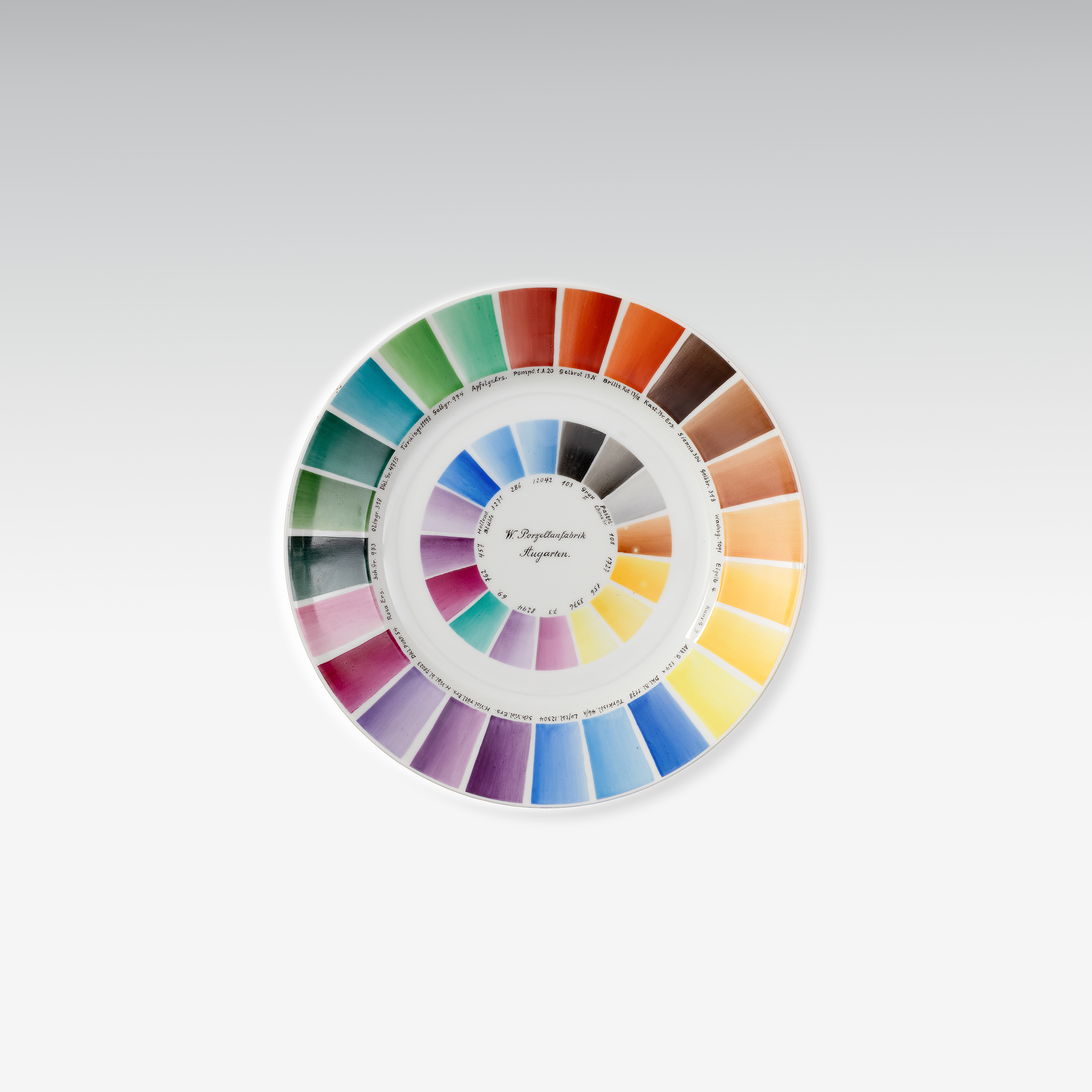 Der Farbmusterteller aus dem Archiv der Wiener Porzellanmanufaktur Augarten dokumentiert die hauseigene Farbpalette von 1949.
