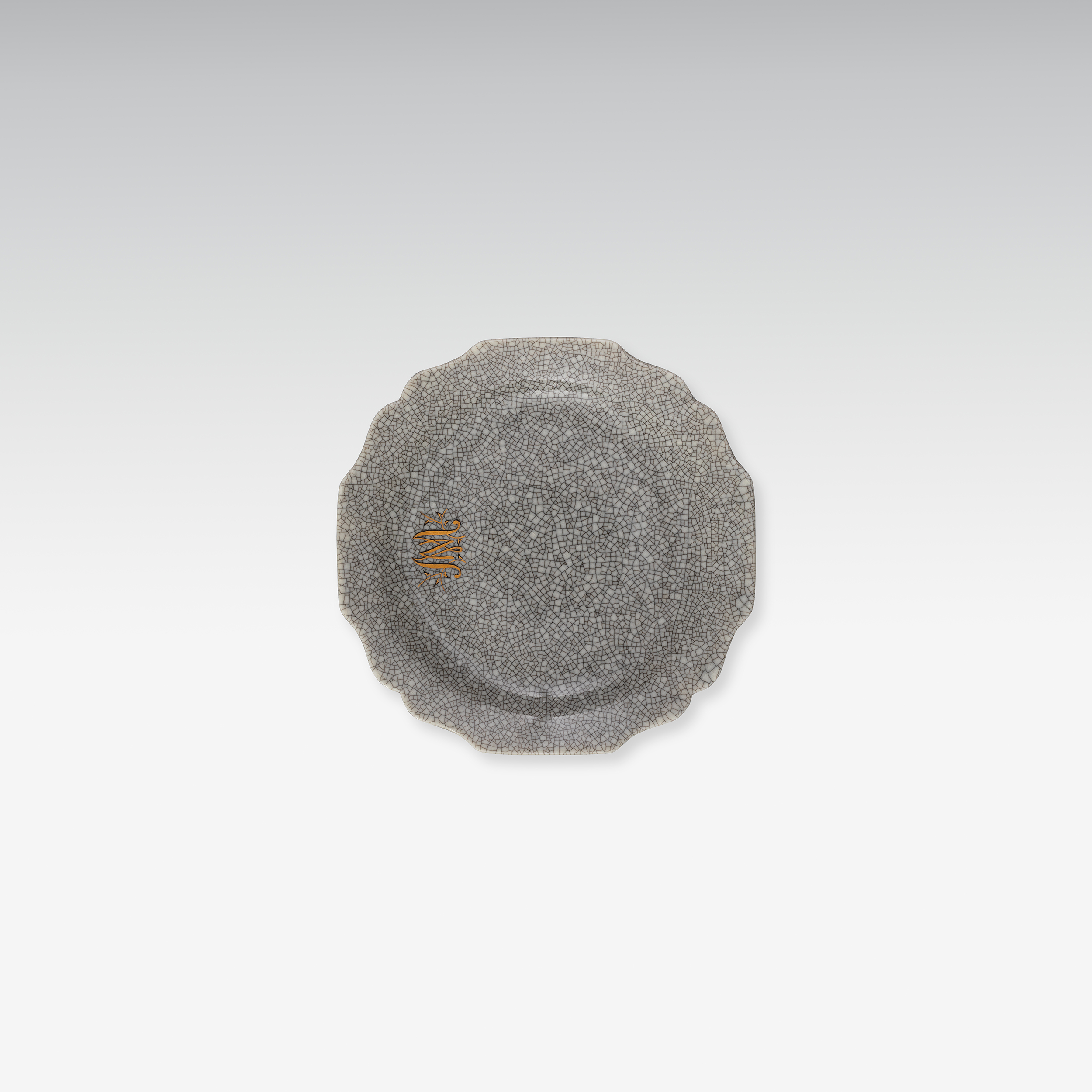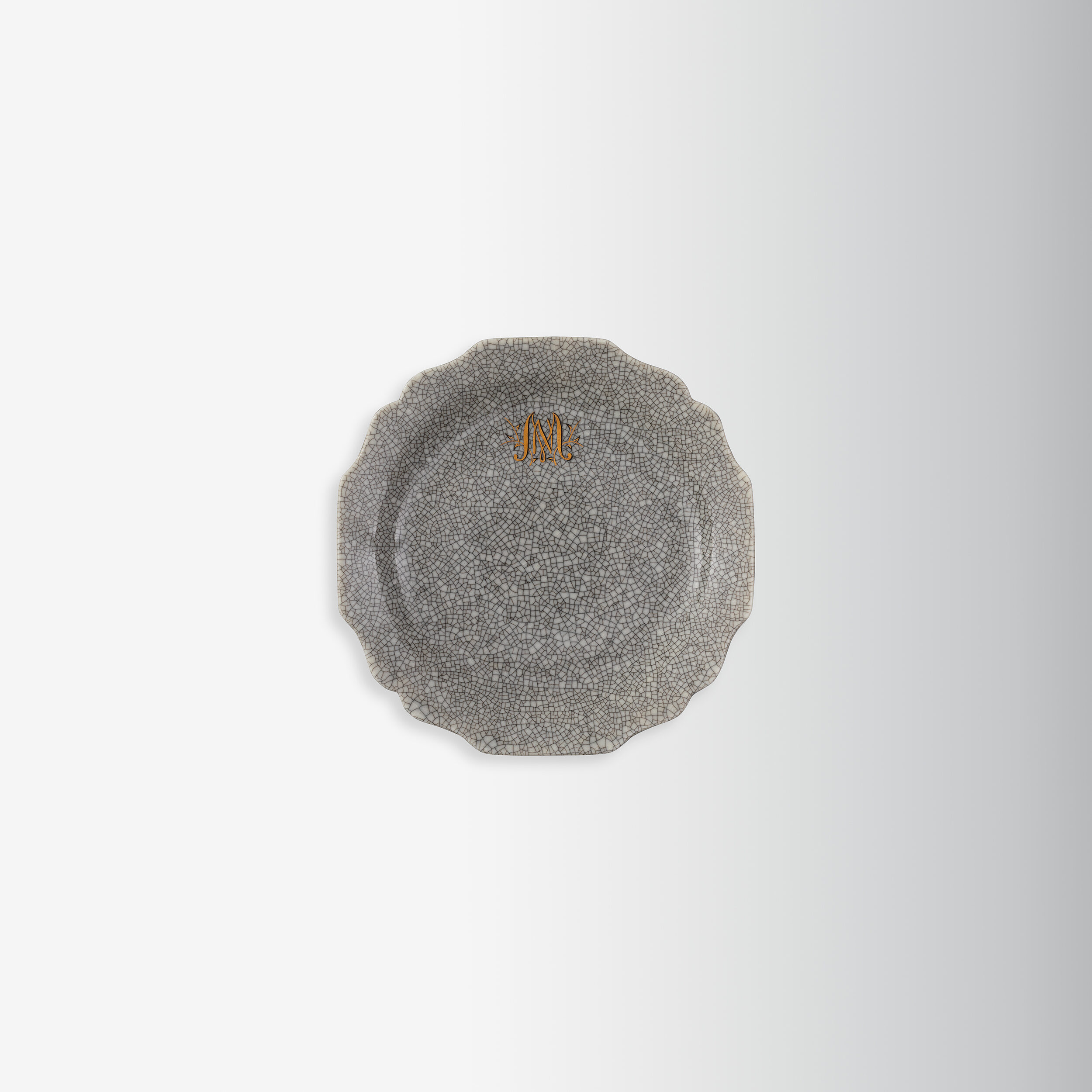 Musterteller nach einem barocken Wiener Vorbild von c. 1725 (Belvedere) mit Craquelé-Glasur in Grautönen, das Goldmonogramm MN von Obermaler Edwin Breideneichen.