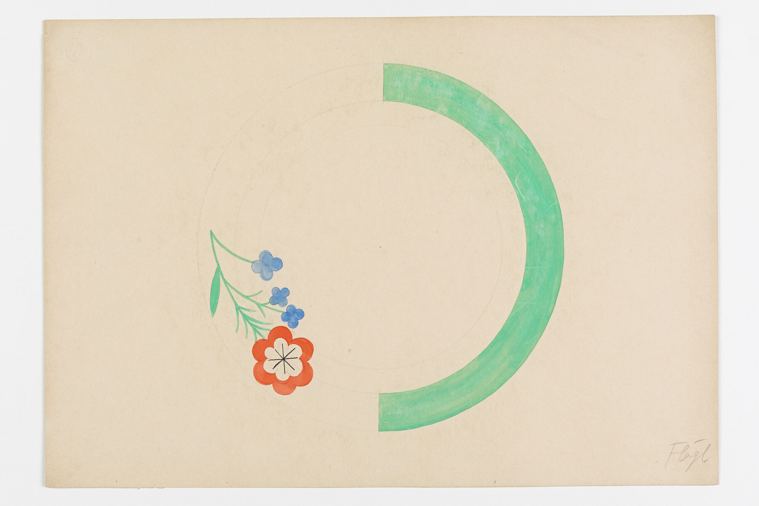 Dekor mit roter Mohnblume und luftblauen Vergissmeinnicht, signiert "Flögl".