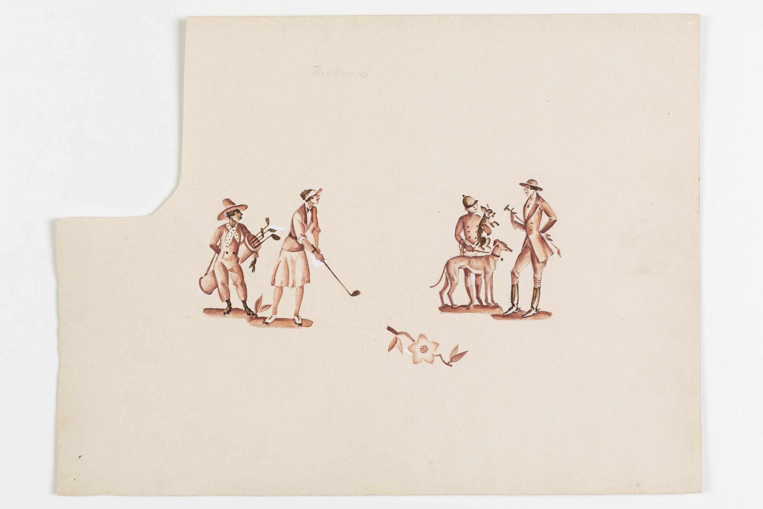 In seinem Dekor für ein Teeservice in Sepia und Luftblau, bezeichnet: Sportfiguren in modernem Stil, stellt der Maler und Illustrator Alfred Hagel Frauen bei Outdoor Sport dar, wie hier bei Golf und Polo.