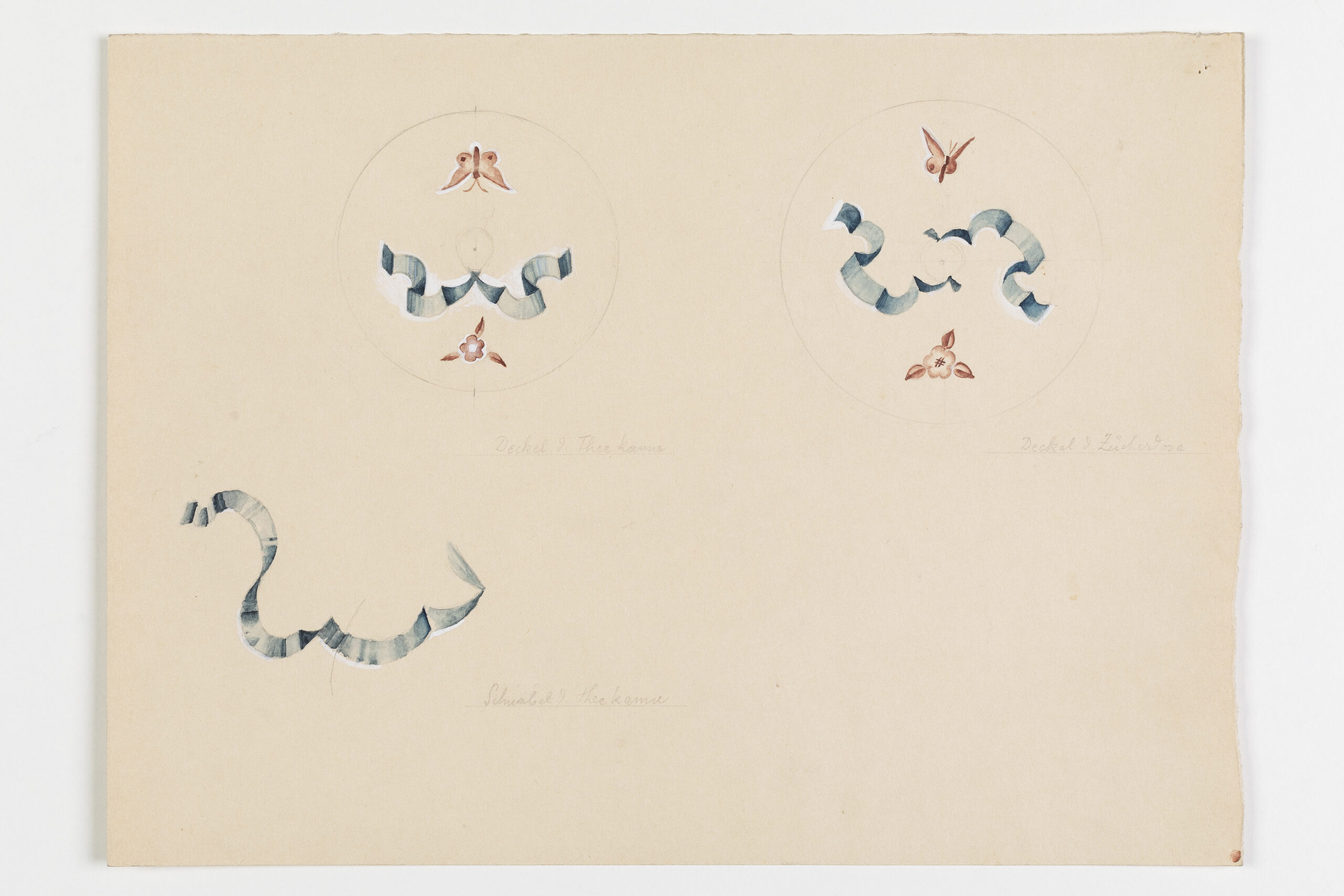 Deckel- und Tüllendekore mit Bändern, Schmetterlingen und Blüten für ein Teeservice mit modernen "Sportfiguren"; Design von Maler und Illustrator Alfred Hagel