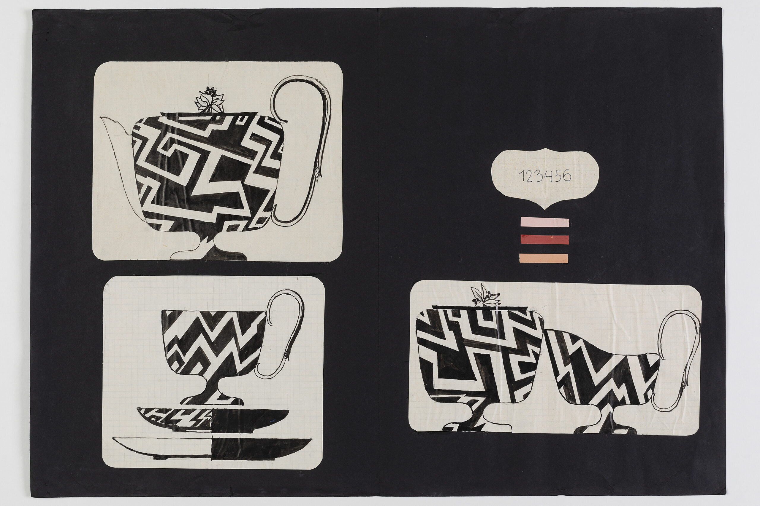 Das Blatt zeigt eine kühne Idee des späten Josef Hoffmann für Augarten und versucht, Glas- und Silberdesigns in Porzellan umzusetzen. Das Service ist nicht realisiert worden, doch beeindruckt seine Eleganz.