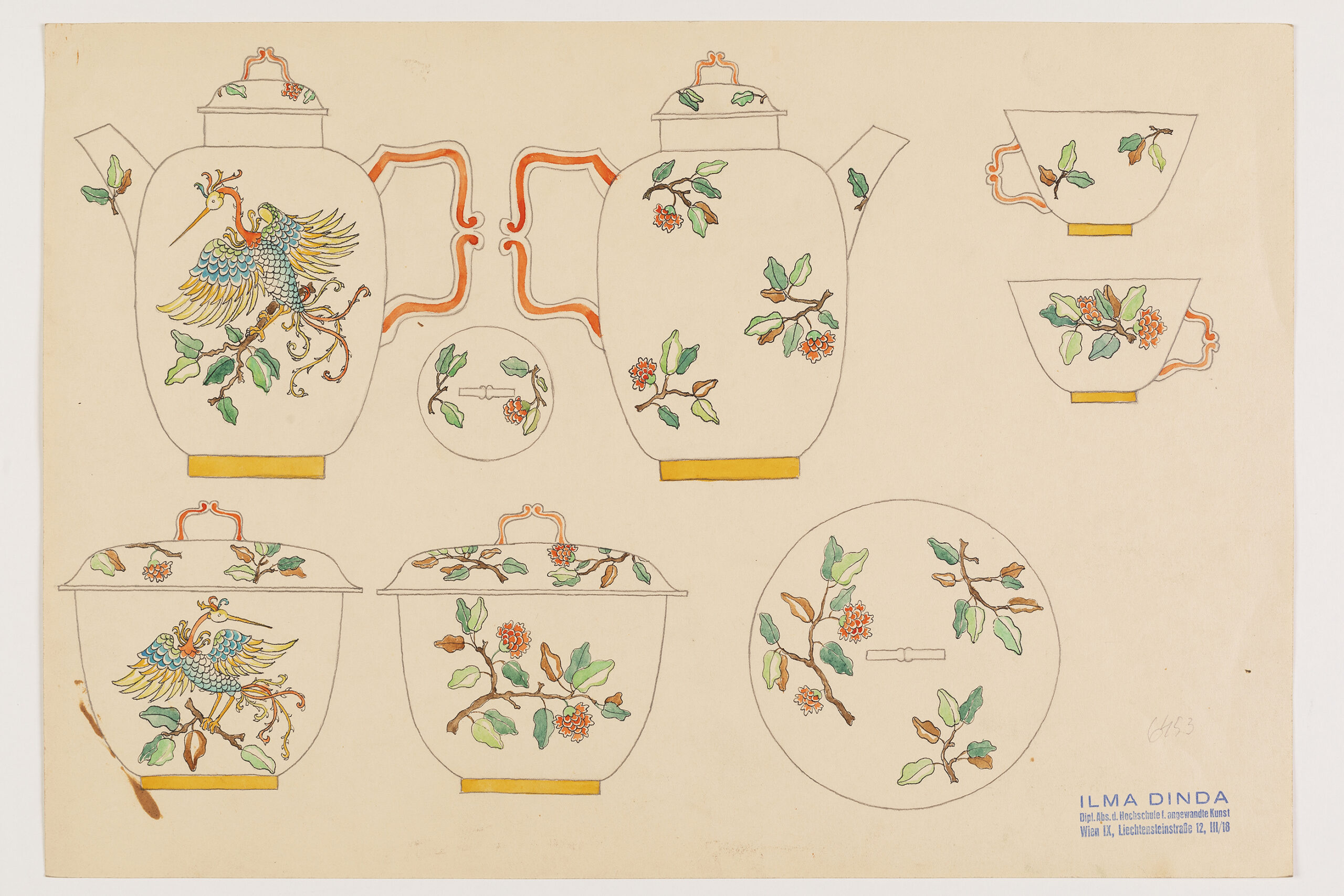 Mit ihrem an chinesische Dekore erinnernden Design für ein Teeservice greift Ilma Dinda die auch in den 1950er Jahren präsente Bewunderung für ostasiatische Kunst zurück.