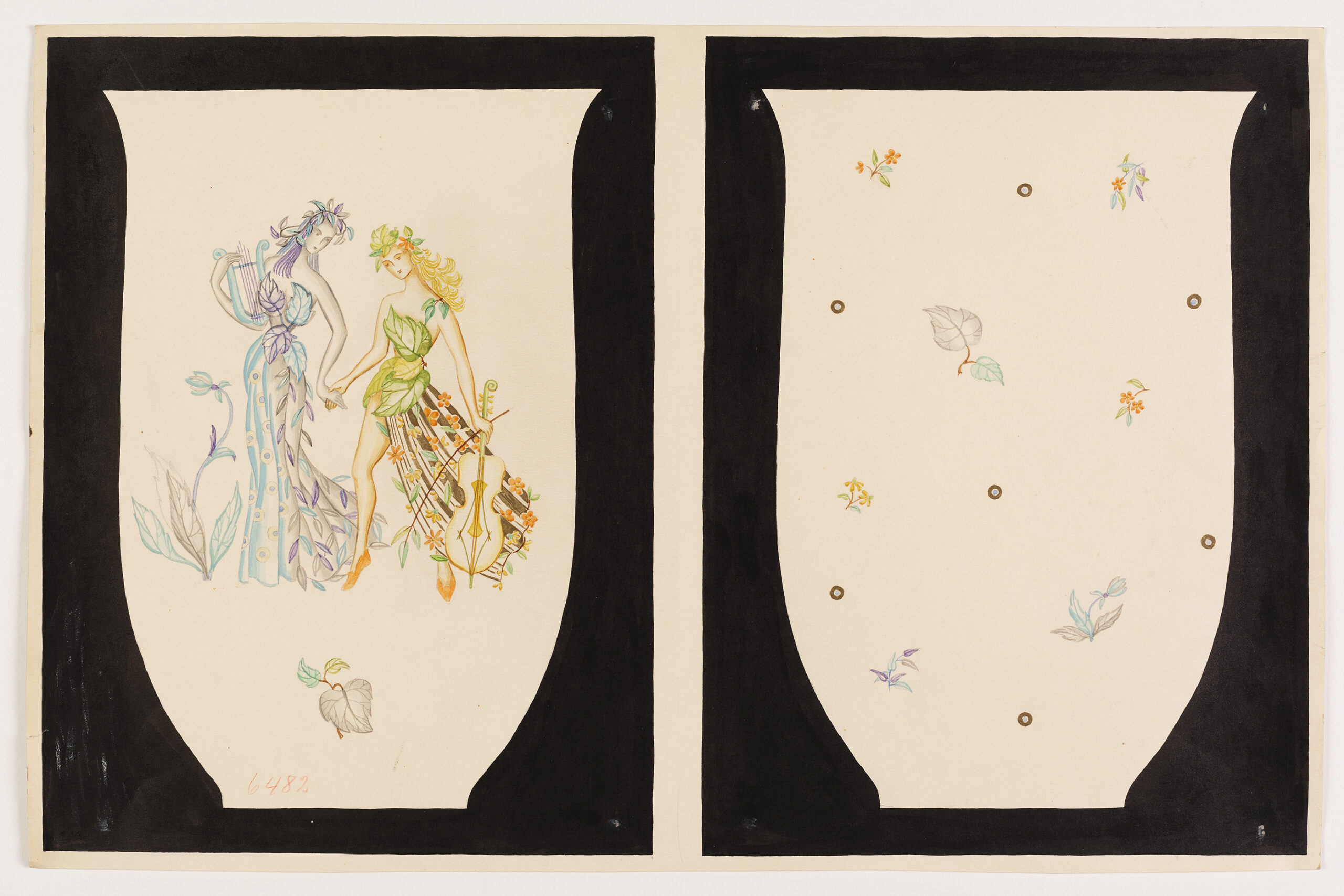 Blatt mit zwei Ansichten einer Vase, bemalt mit dem Dekor Licht und Schatten von Ilma Dinda für Augarten.