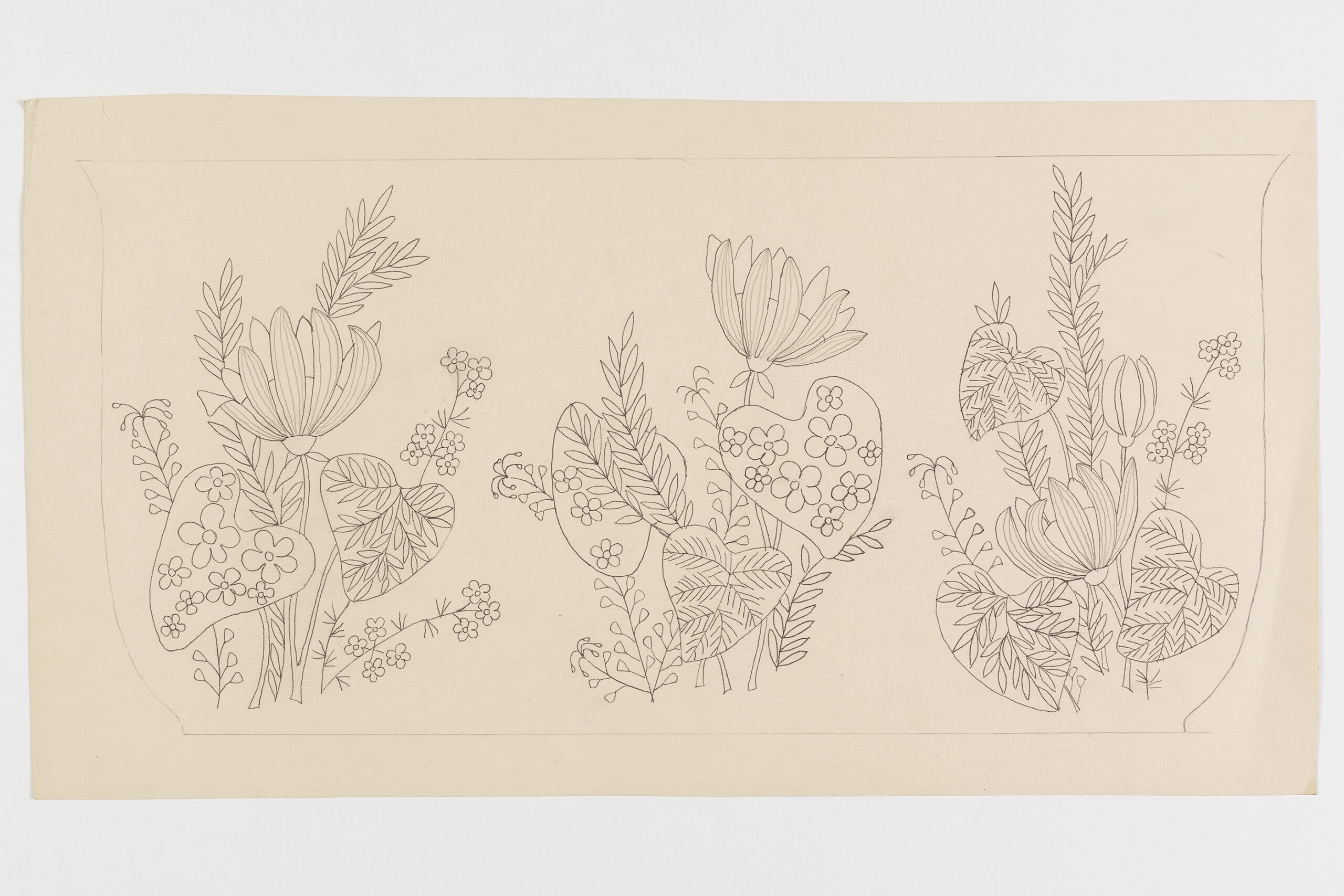 Blatt mit drei Seiten einer Vase und Blütendekor; Design von Ilma Dinda.