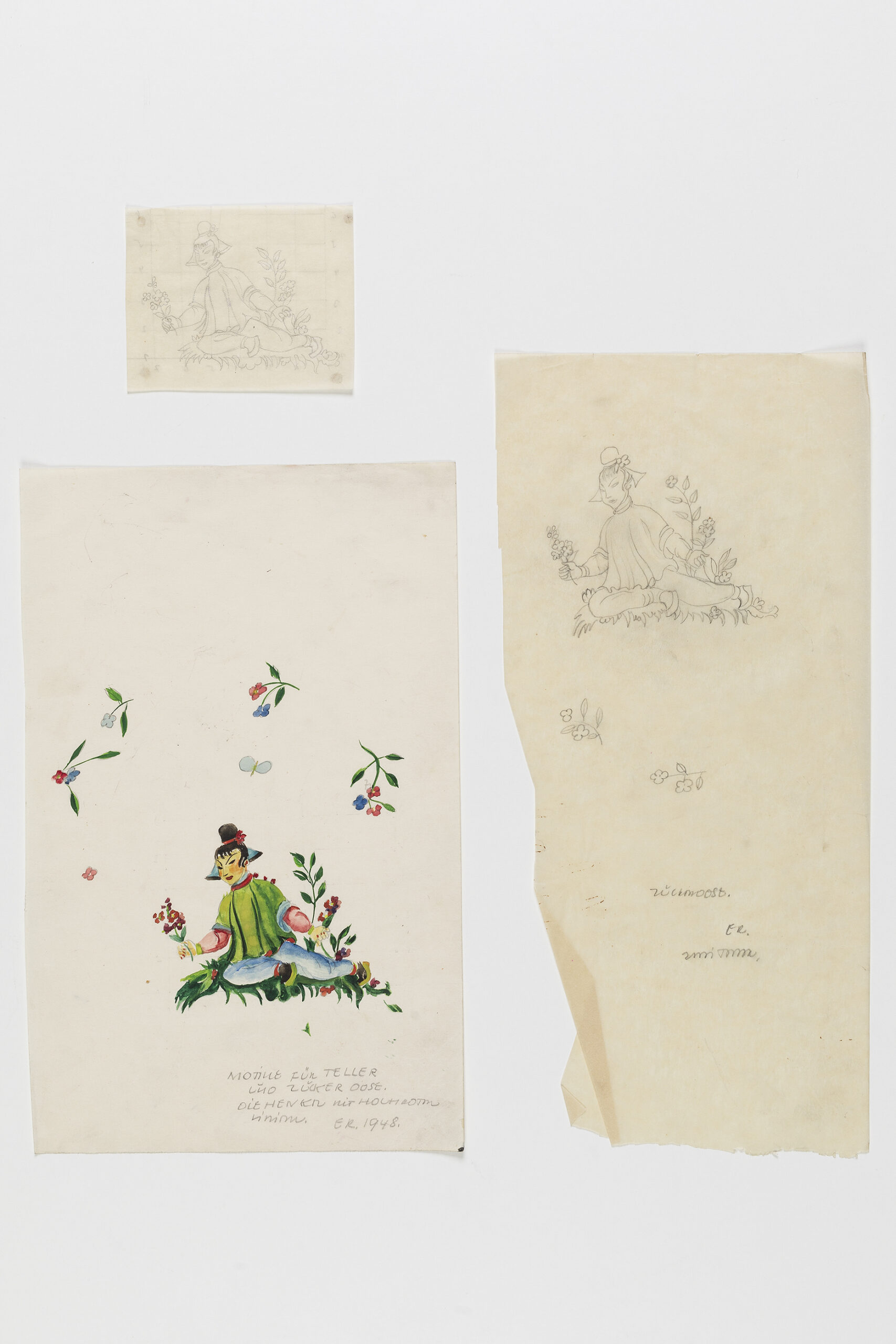 Drei Stadien eines Chinoiserie-Entwurfs eines Mädchens mit Blumen für eine Zuckerdose.
