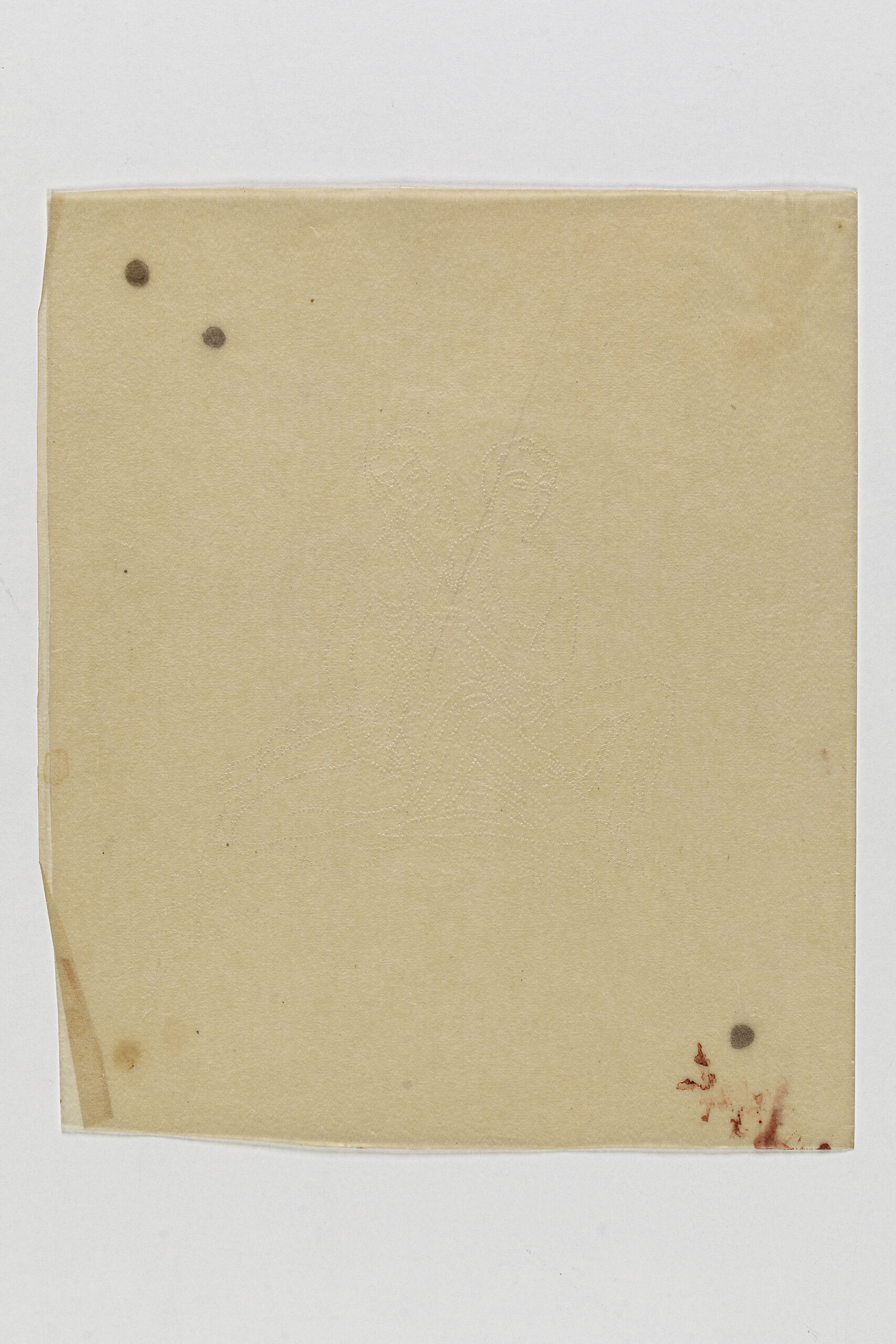 Die auf Pauspapier durchgestochenen Umrisse der beiden sitzenden Frauen dienen dazu, das Motiv als Vorlage für den Maler auf Porzellan zu übertragen (Originalentwurf WPA0115).