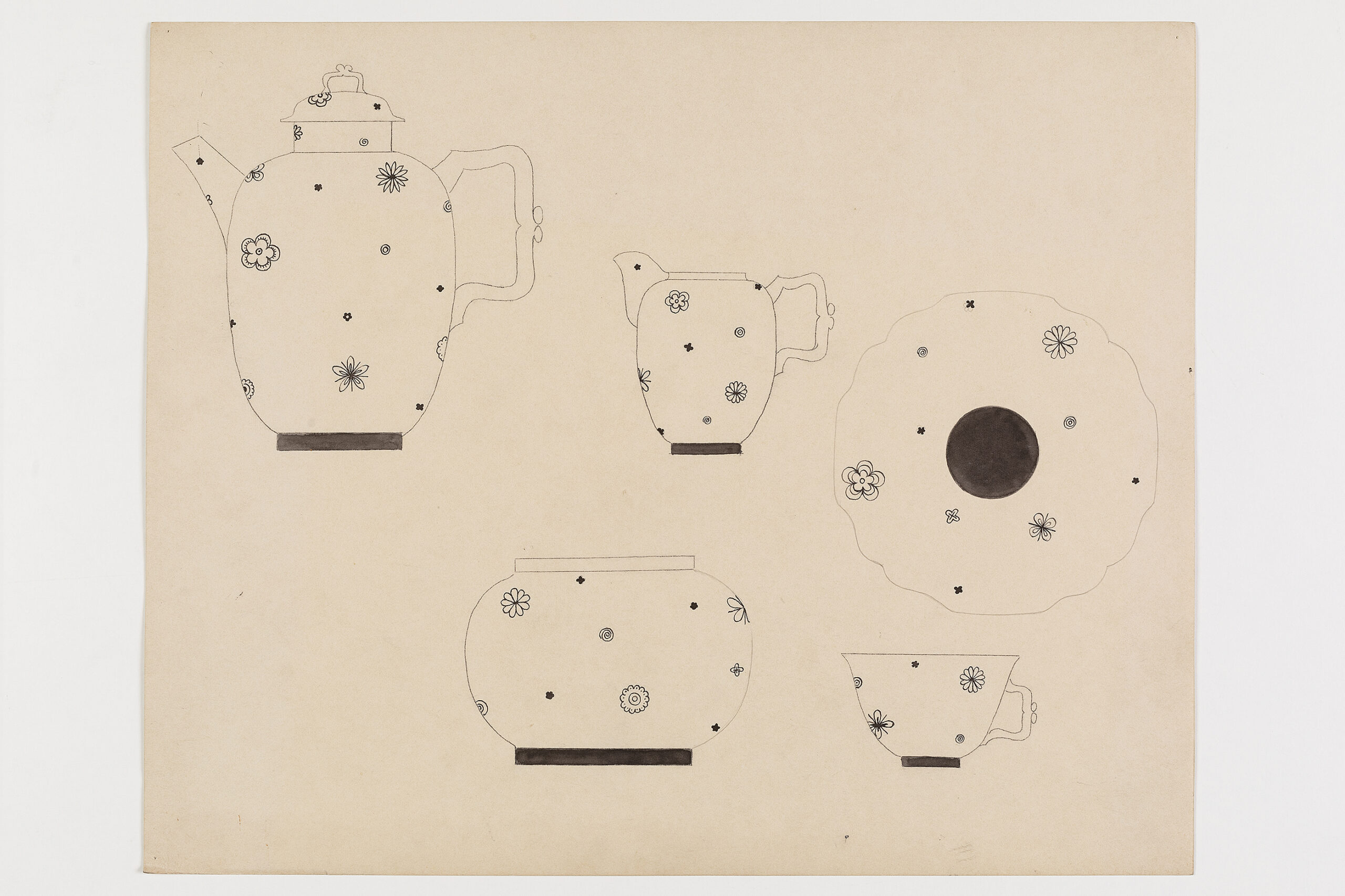 Entwurf von Elfriede Rammel für den Dekor eines Kaffeeservices (Form 114 Belvedere) mit grauschwarzen Streublüten.