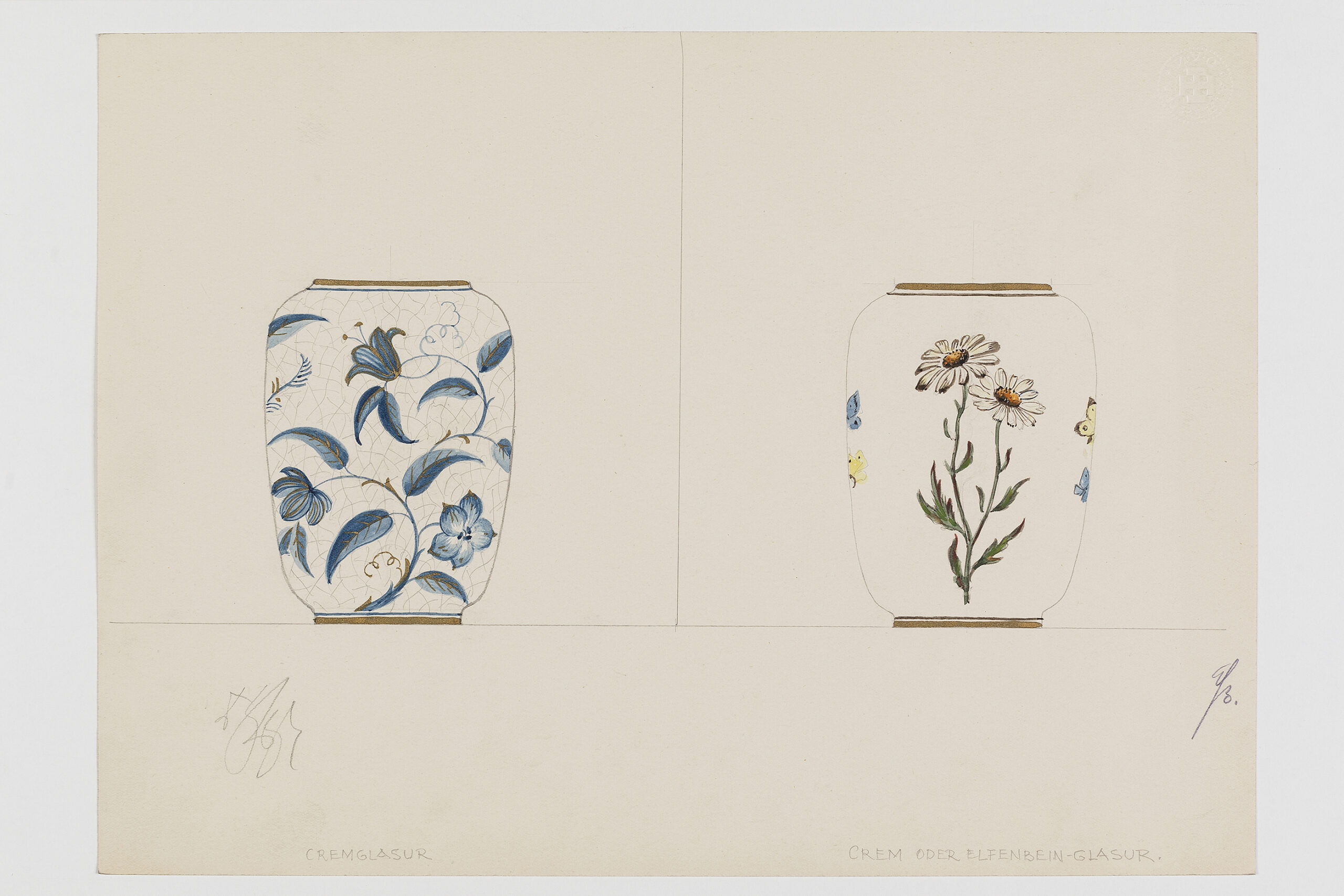 Blatt mit zwei Vasendekoren mit stilisierten blauweißen Blüten auf cremefarbener Craqueléglasur bzw. Margariten und bunten Schmetterlingen auf creme- oder elfenbeinfarbener Glasur.
