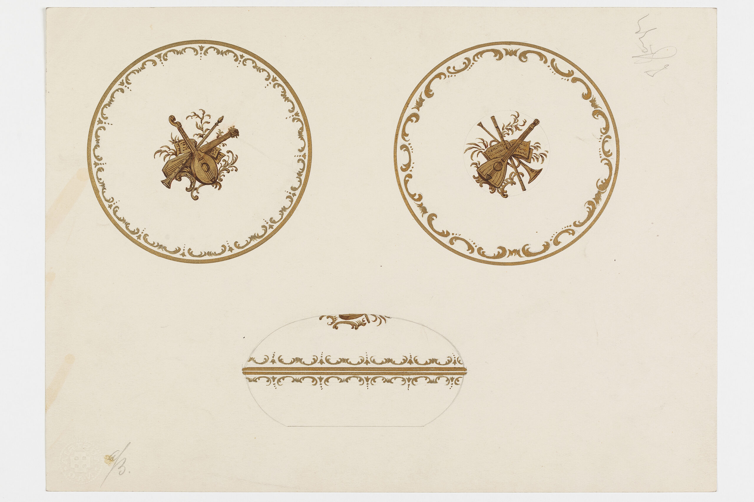 Entwurf: Deckeldose mit Musiktrophäen in Gold (Dekor 6412).