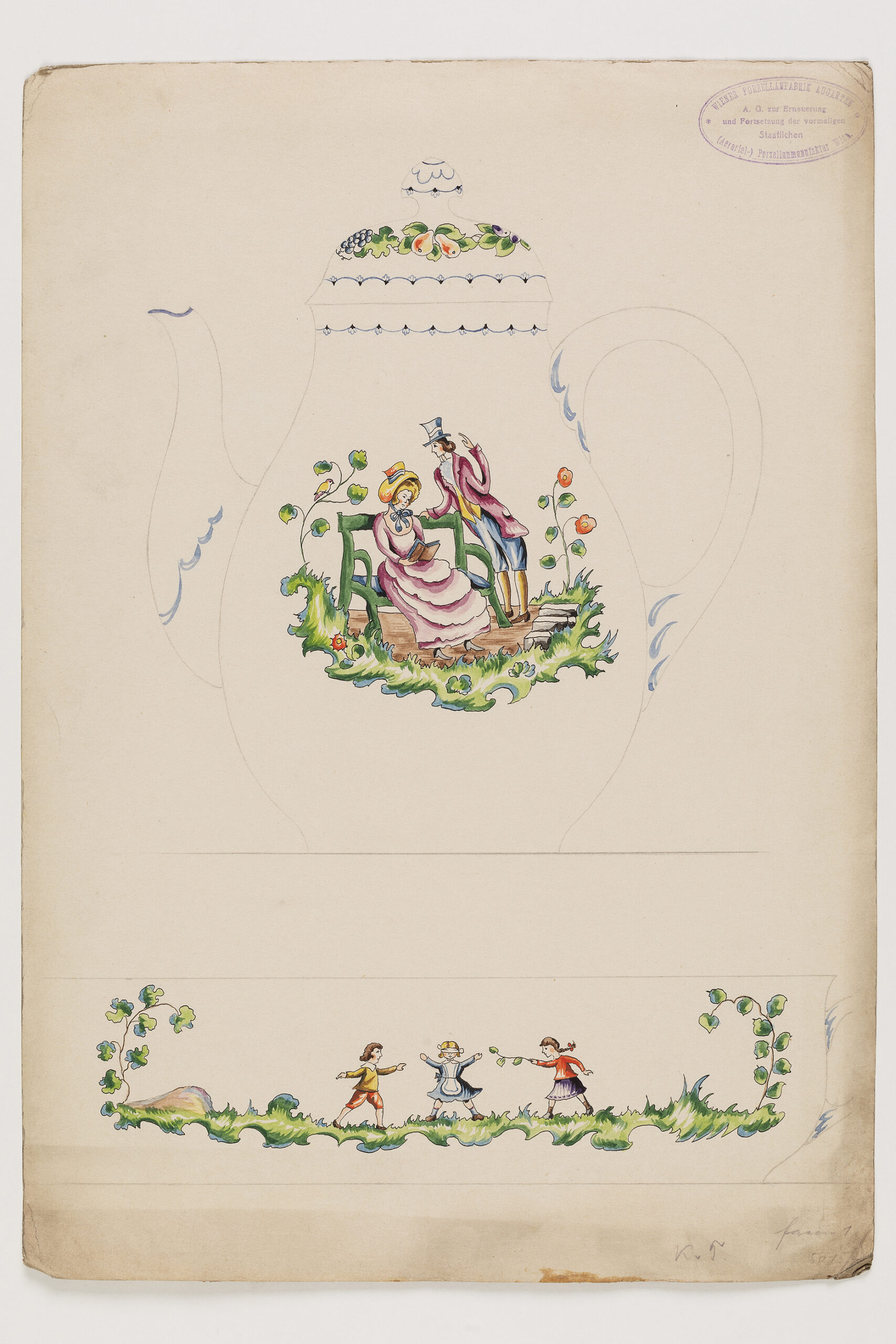 Dekor für ein Kaffeeservice (Dekor Nr. 5015 on Form 1) mit humoristischen "Biedermeierfiguren" in Landschaften, gerahmt von Blaufederkanten.