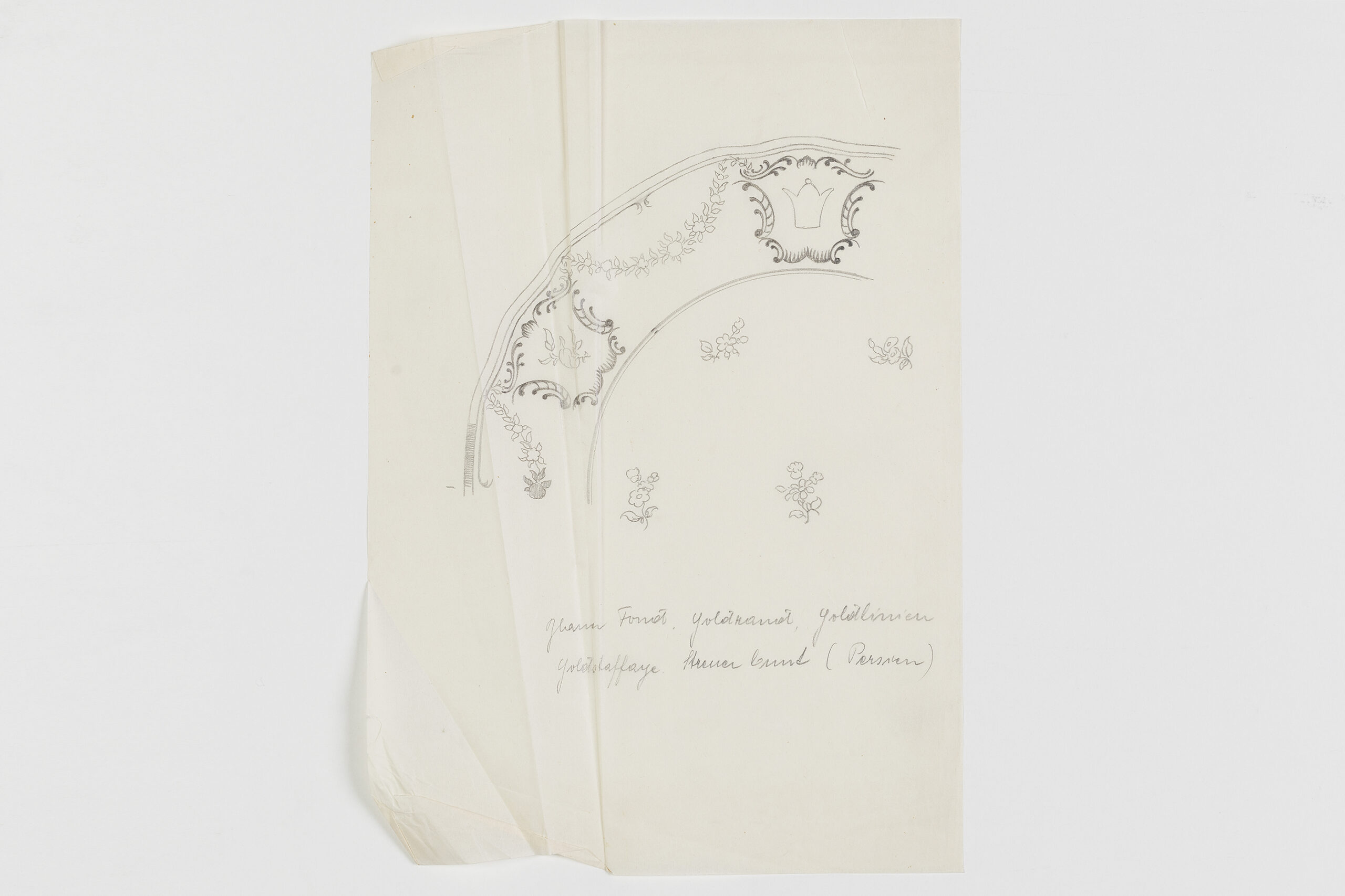 Das Augarten-Designarchiv bewahrt eine Sammlung von Mustern von Wappen, Emblemen und Monogrammen auf, darunter auch dieses mit der persischen Pahlavi-Krone.