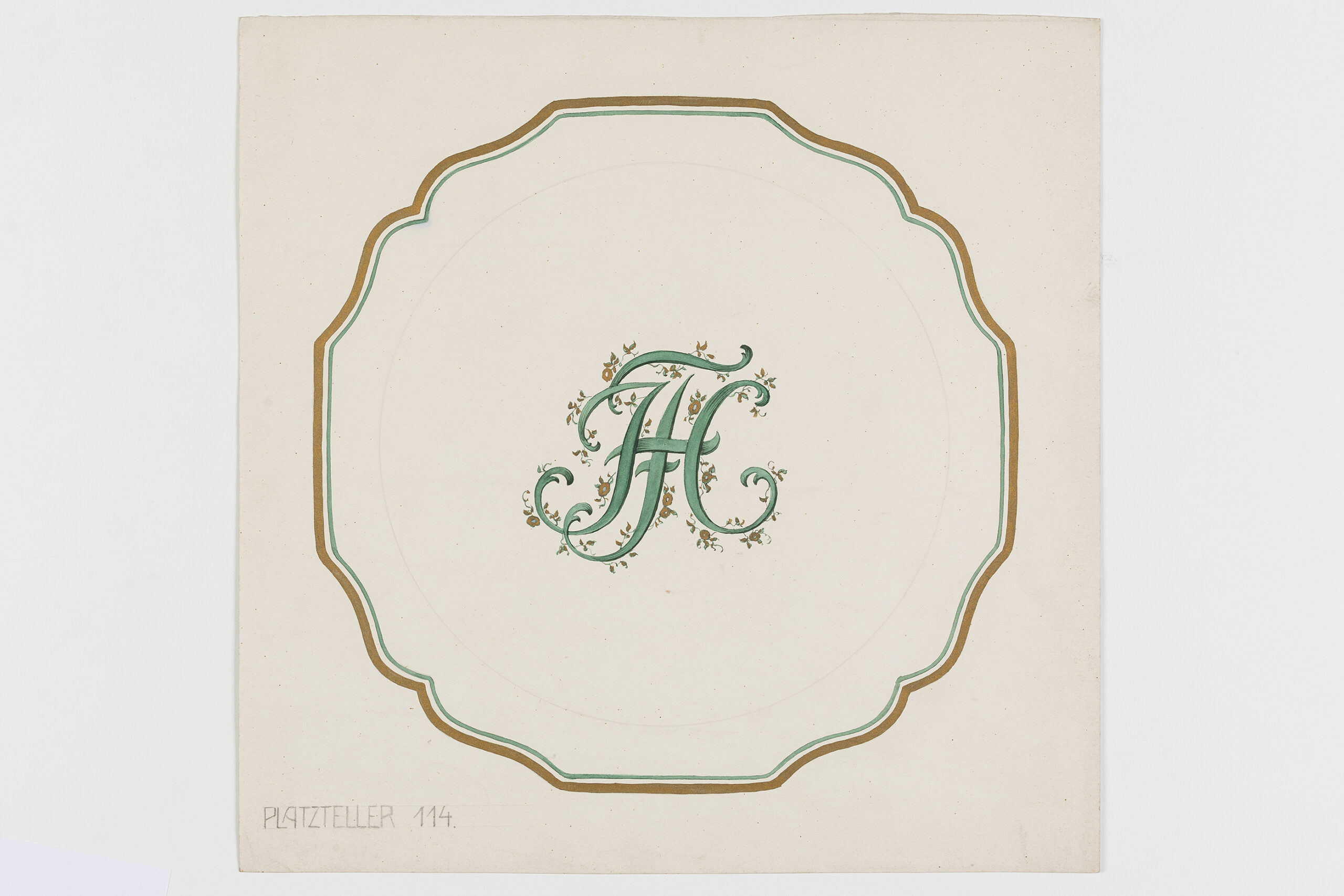 Die ikonische Form des Tellers Form 114 wird seit 1725 in Wien hergestellt, hier als Platzteller mit einem individuell gestalteten Monogramm HF.