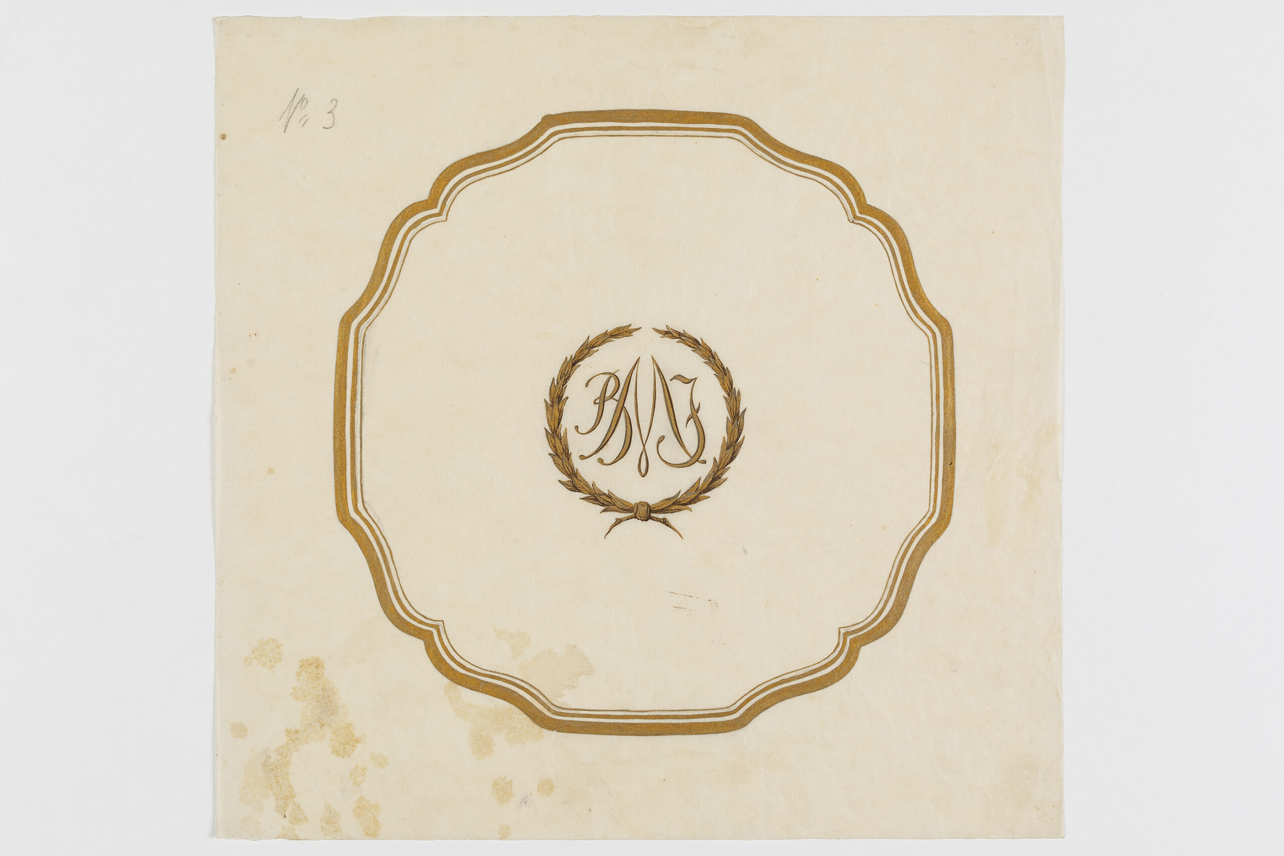 Der Teller, Form 114, ist mit einem goldenen Monogramm BMJ verziert, umgeben von einem vergoldeten Lorbeerkranz und vergoldeten Bordüren.