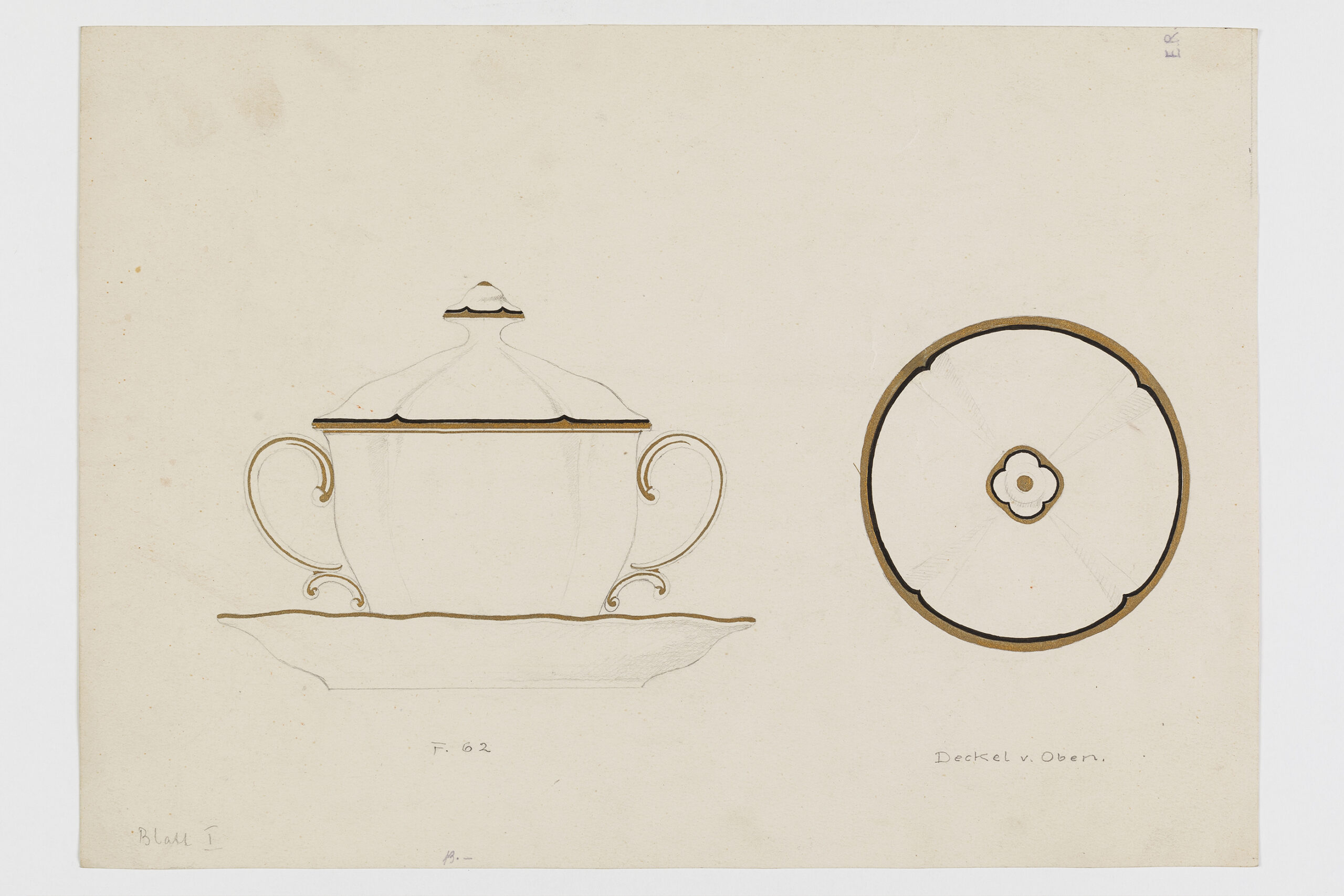 Entwurf, bezeichnet "Blatt I", für eine Deckeltasse (Bouillontasse) mit Untertasse in der barocken Form 62 mit vergoldeten und schwarzen Rändern.