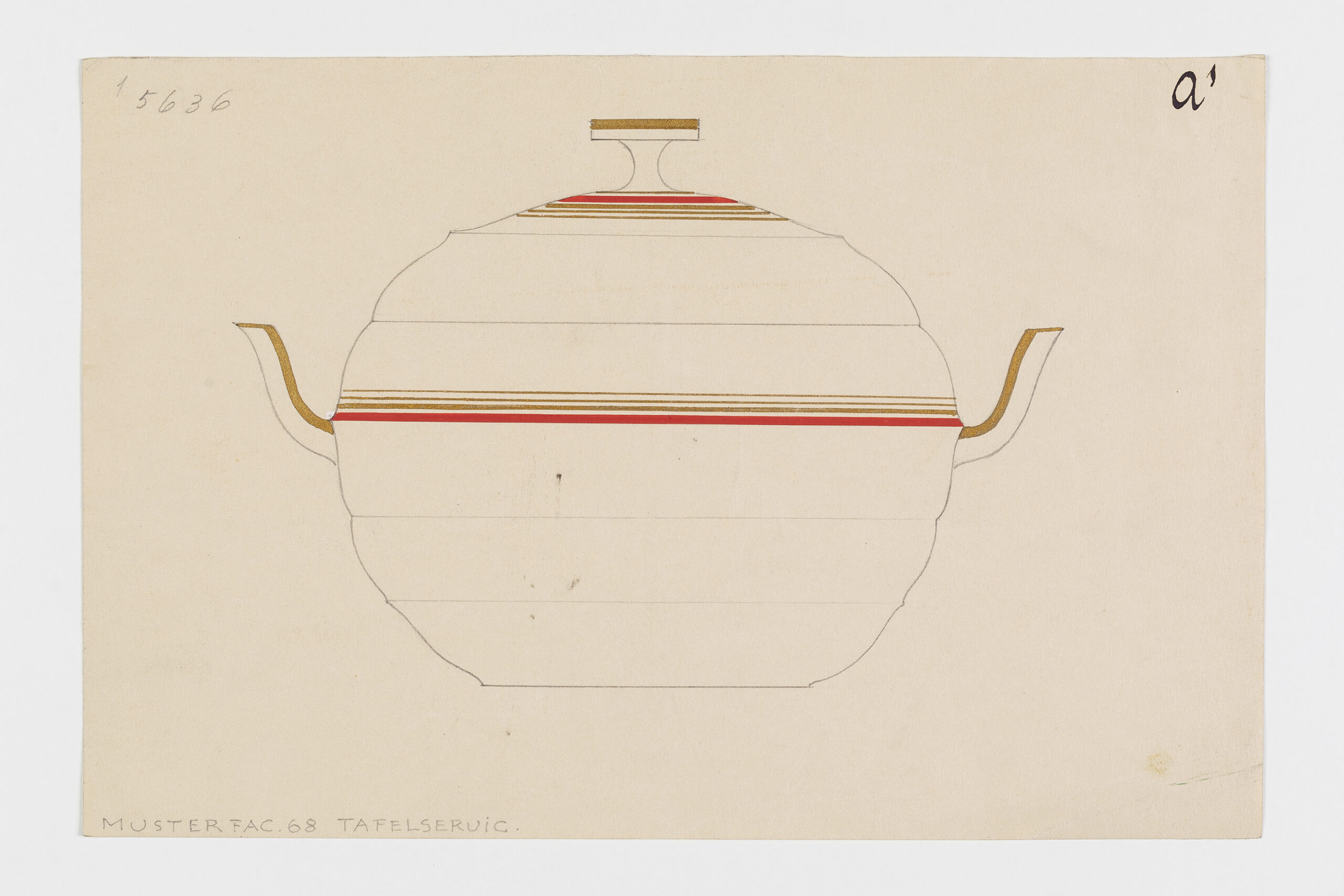 Musterdekor mit Linien und Rändern in Rot und Gold für eine Deckelterrine, Service 68 von Michael Powolny, Dekor 5636, unbekannte:r Entwerfer:in.