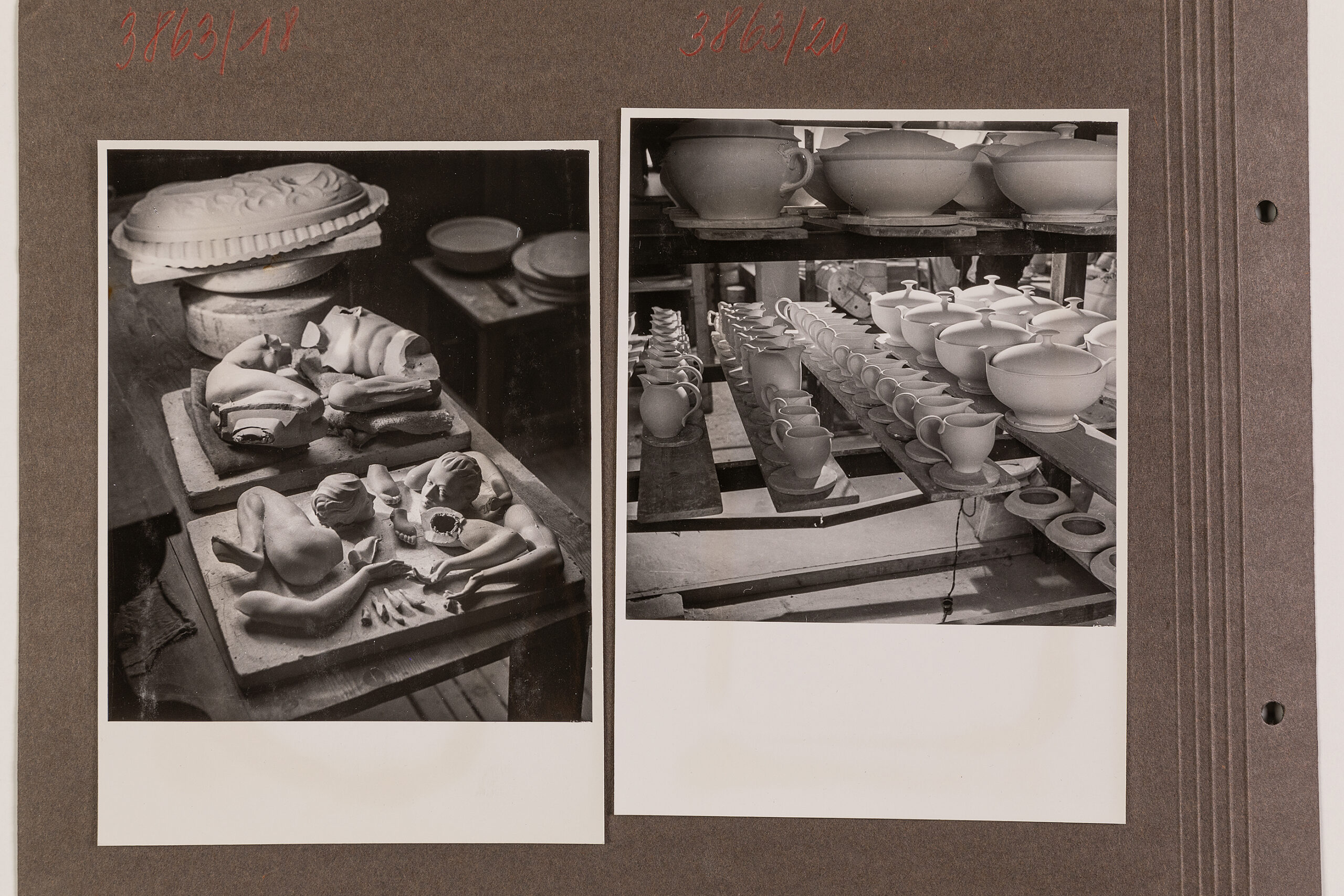 Historische Werbefotografie: Formen der Gruppe "Handkuss" und Porzellan vor dem Glasurbrand